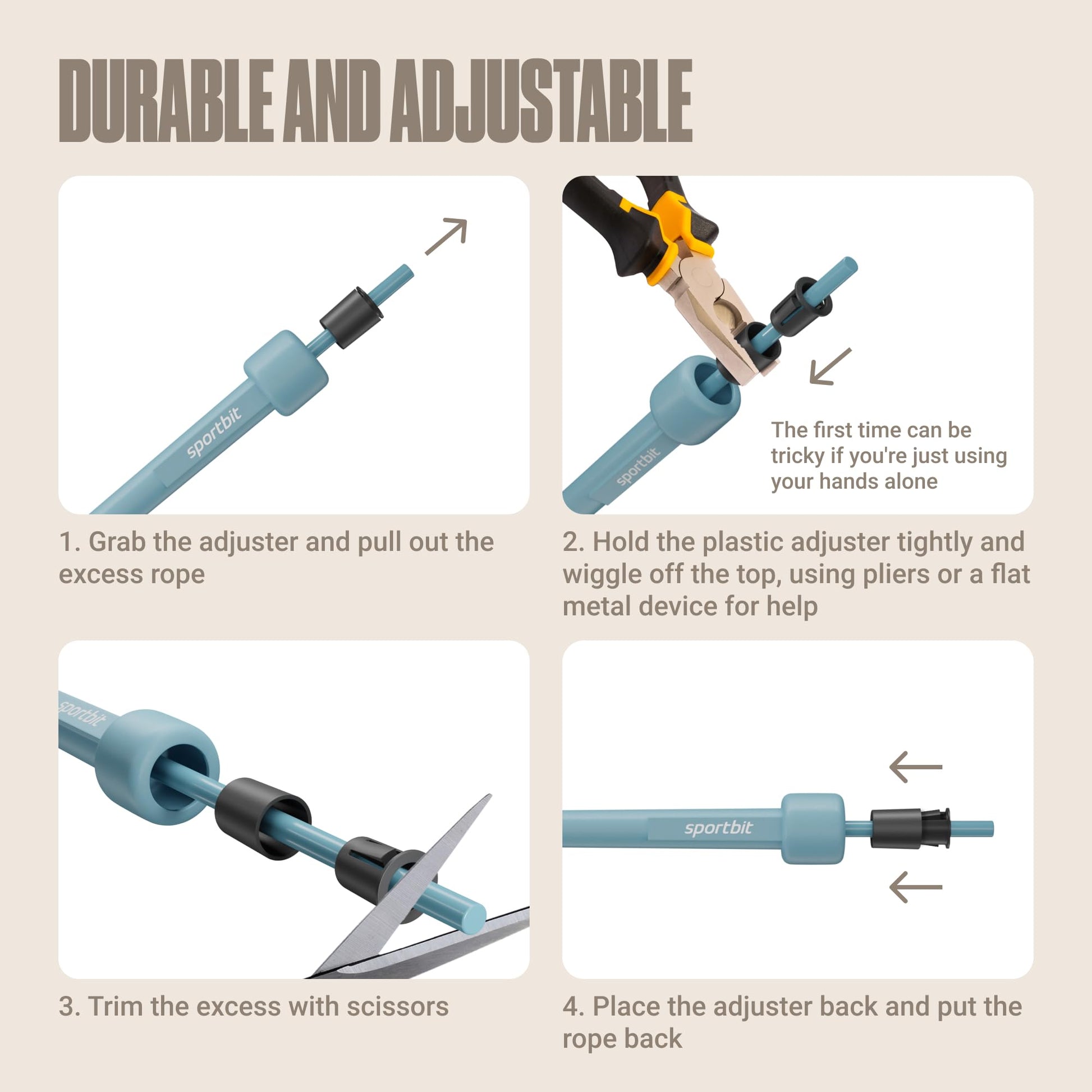 • ADJUSTABLE: The SPORTBIT jump rope for fitness is easy to cut and customize. You can even use kitchen scissors when adjusting the size of your skipping rope. This jump rope for men, women, and is 118 inches long, so it’ll work for any height! Plus, no internal wires or metallic parts guarantees you safety and ease of use.