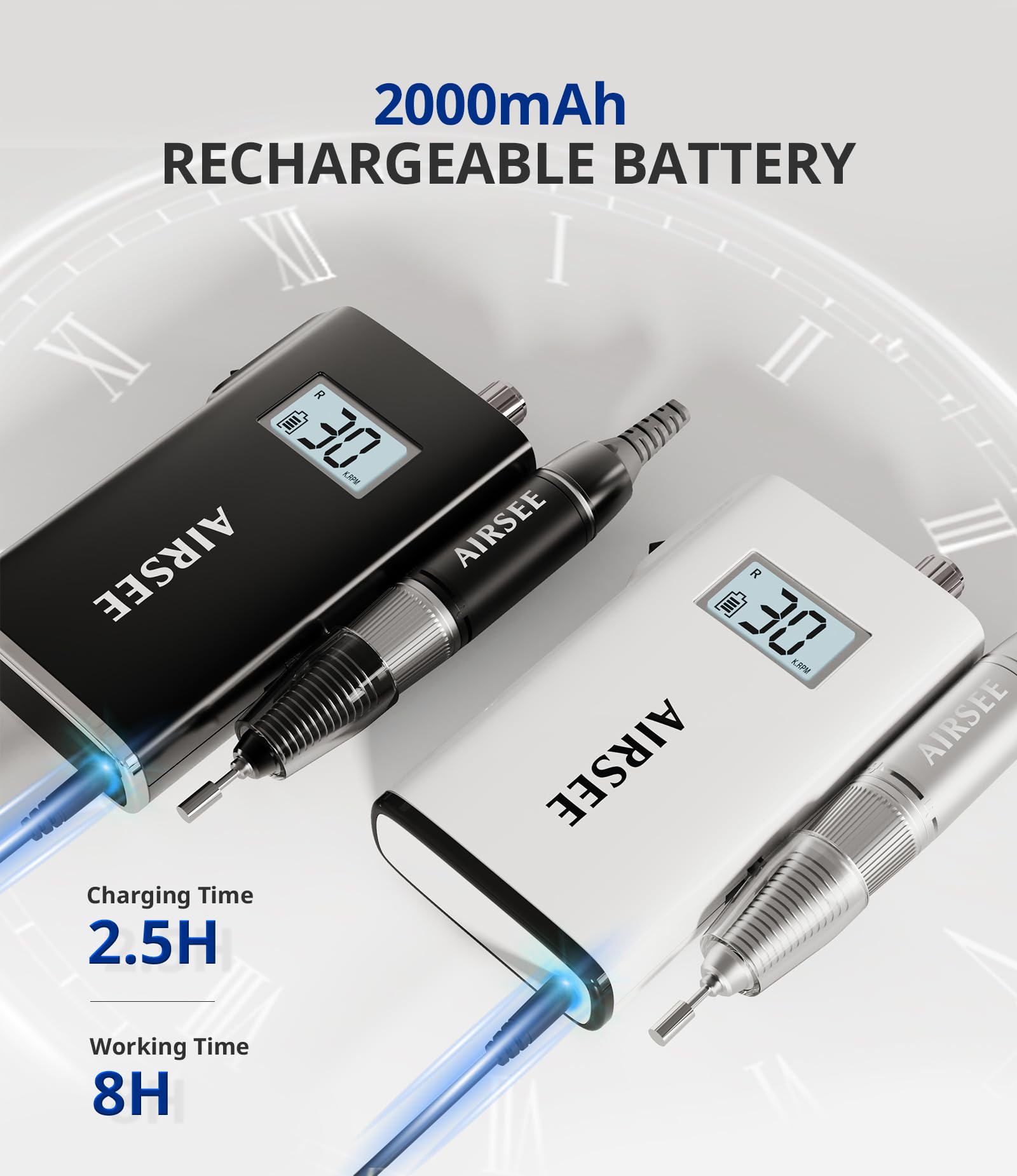 AIRSEE Rechargeable 30000RPM Electric Nail Drill Professional Portable E File Machine for Acrylic Nail Natural Extension Gel Nails Polish Cuticle, Cordless High Speed for Salon Home Use E8 White