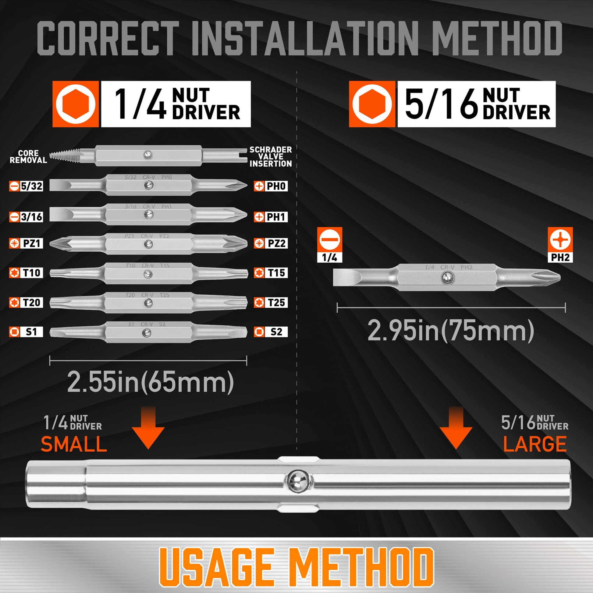• [High-Quality]: Industrial strength heat treated bits, Phillips Bit:PH0 PH1 PH2, Pozidriv Bit:PZ1 PZ2, Torx bit:T10 T15 T20 T25, Square Bit:S1 S2, Slotted Bit:5/32" 3/16" 1/4", Nut Driver:1/4” 5/16”, Core removal and schrader valve insertion bit.
