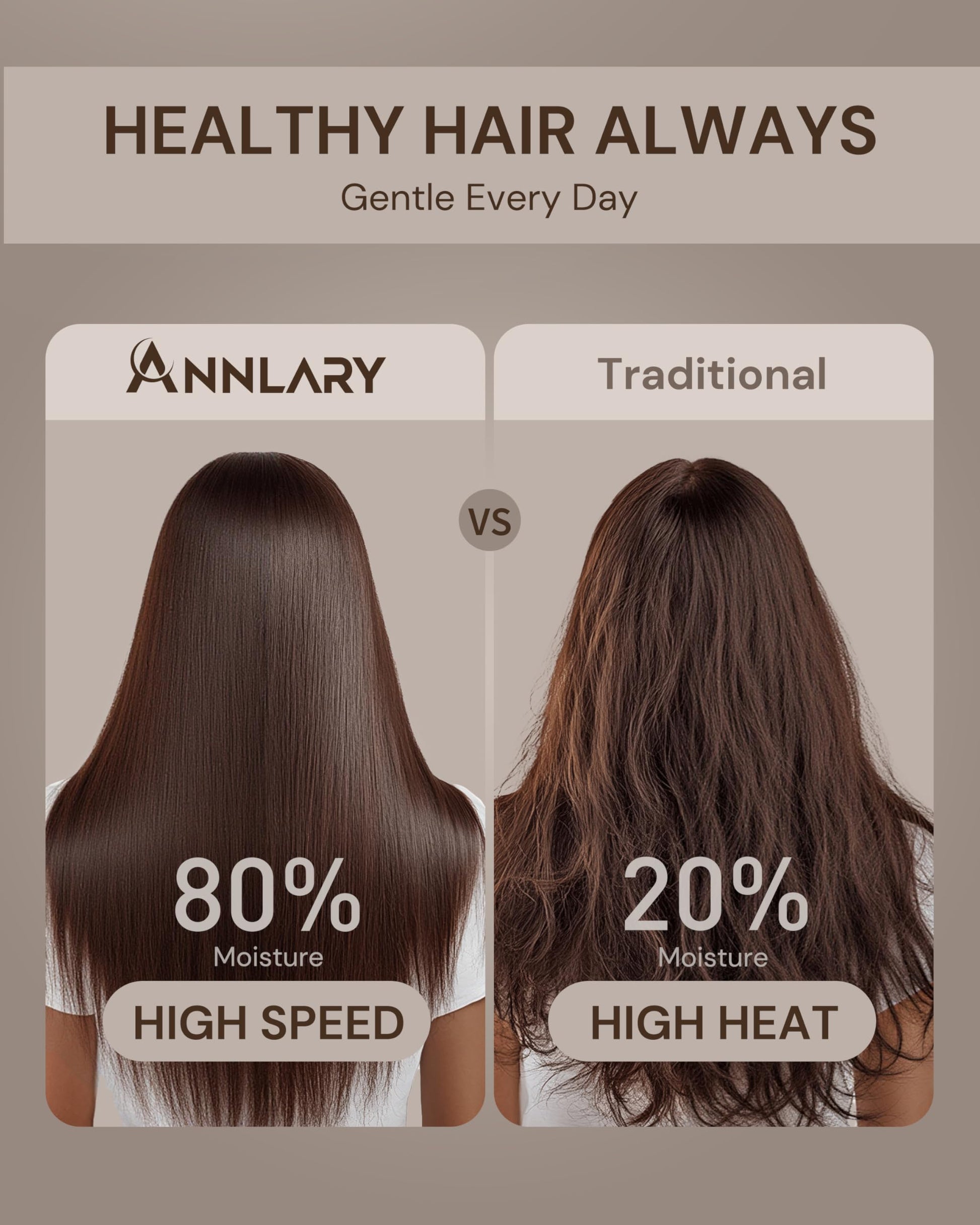 • Ultra-Fast Drying with 110,000 RPM Motor - Equipped with a high-speed 110,000 RPM motor and 1500W of power, ANNLARY delivers strong 25 m/s airflow to dry hair up to 3× faster than traditional dryers—saving time while protecting shine.