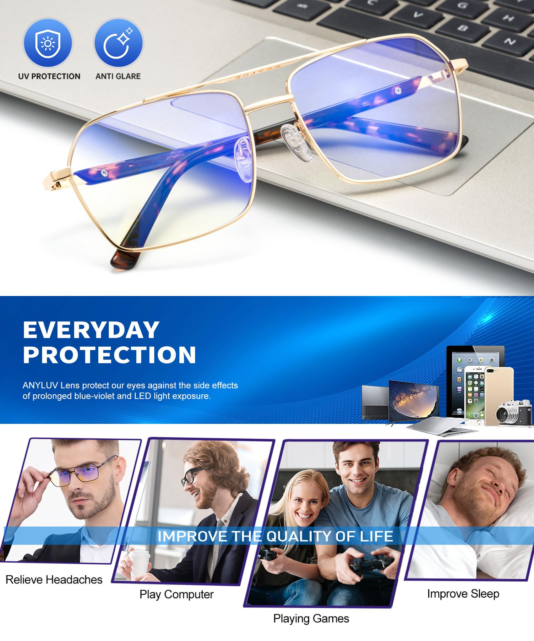 • Blue Light Blocking Rate: 45%: These blue light blocking glasses can filter 45% of high energy harmful blue light from computers and other devices, help release eye fatigue. When you reading books or looking on electronic screens for long time, these ANYLUV blue light glasses for men can help make eyes relaxed, meantime improve sleep quality