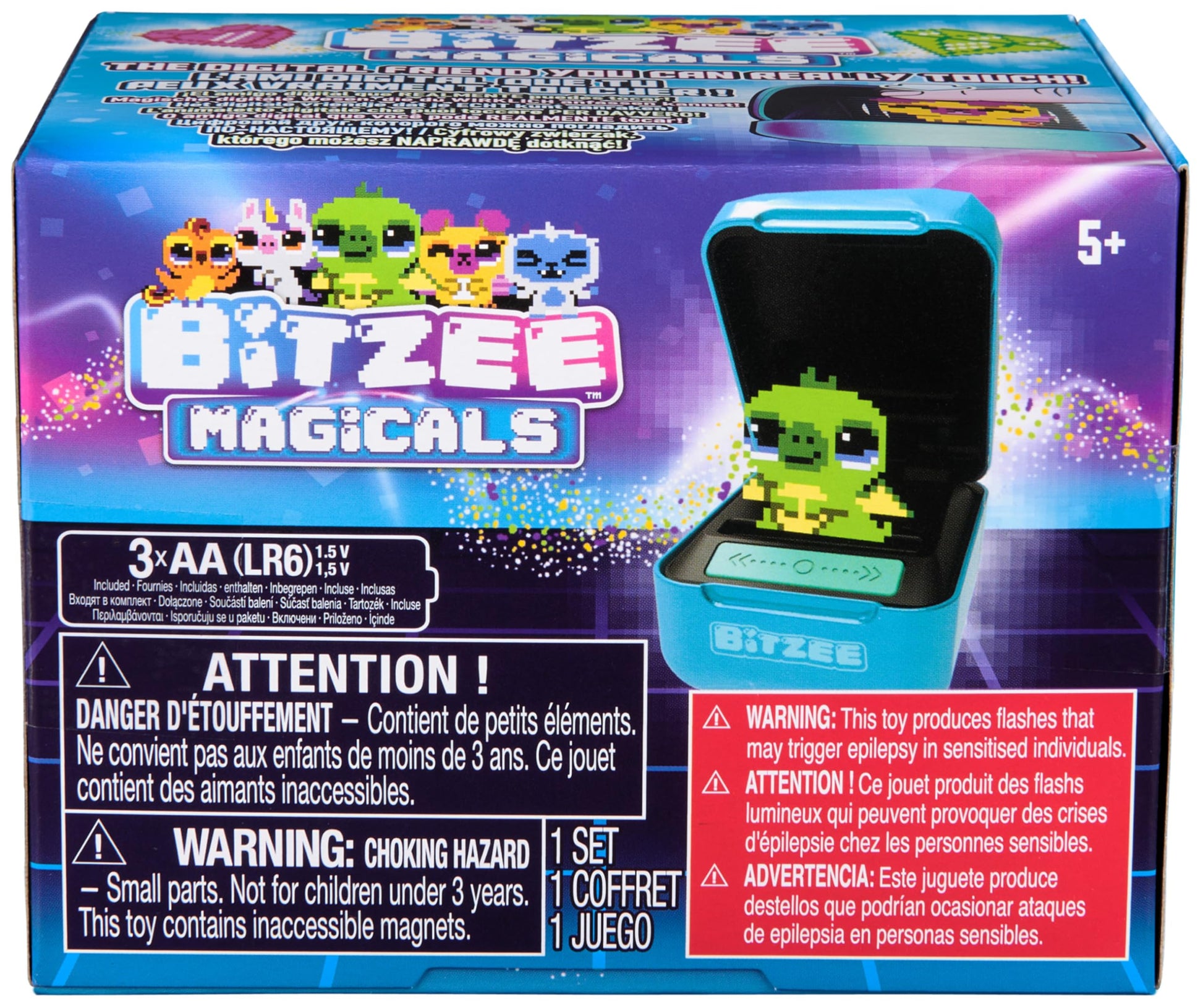 Details: Introducing Bitzee Magicals, fantastical digital friends you can really touch and feel. Just like Bitzee digital pets, Bitzee Magicals respond to swipes, tilts, shakes and touch with sounds and silly reactions. Each Magicals character starts a baby and needs your love and care to grow. The more you play, the more Magicals you’ll unlock. Feed them and play, rock them to sleep, clean up after them and give them love. Watch them grow from baby, to adult, to Super Bitzee. When a rare or legendary Bitzee friend becomes a Super Bitzee, it splits between 1 of 2 possible Splitzee characters. Play unique games with your fully evolved Magicals and collect gems to add to your Treasure Chest to attract new characters. Plus, there’s more ways to play: use the Magic Wand to cast spells and experience a fun transformation and earn new Potions as you play games to change your friend’s colors. Collect all 20 Bitzee Magicals and take your collection anywhere. Kids and adults will be mesmerized with Bitzee’s screen-free innovative twist on 90s toys & games. Must-have for birthday gifts and Christmas gifts. Includes 3 AA batteries. Bring home a new way to experience Bitzee toys with Magicals.