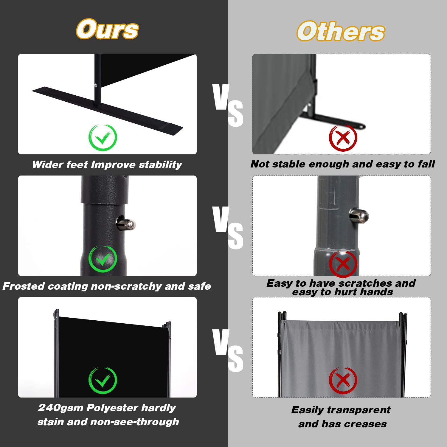 • Upgrades of materials: The panel of wall divider are made of watertight, non-see-through and tear-resistant high density 240g polyethylene fabric . The metal frame of the room divider wall is made of strong iron and powder coating, which increases its rust and wear resistance, and also extends his service life. At the same time widened support feet also increase its stability