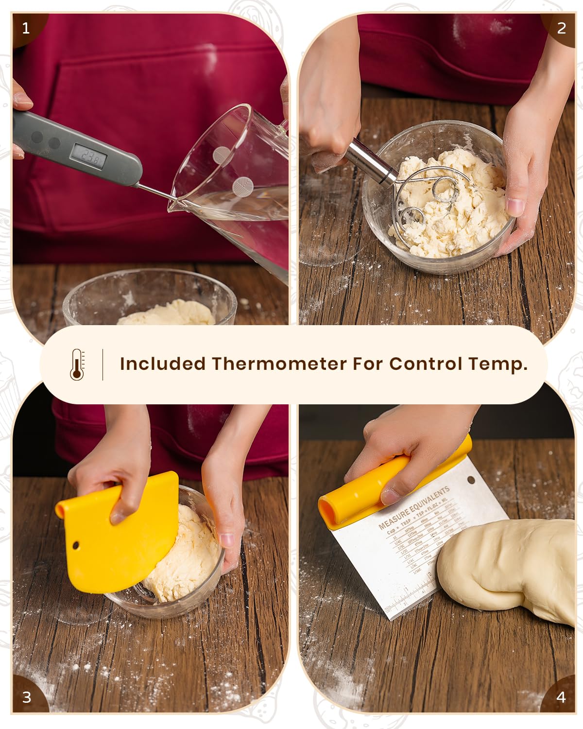 • Sourdough Starter Kit: Complete Set for Beginners, it includes a Banneton proofing basket, linen liner, and cover for optimal dough fermentation, a food probe thermometer for precise temperature monitoring, a dough scraper with measurements, and a smooth-lined dough scraper suitable for kids, Dough Whisk, Oil Brush, and Bread Lame Set.