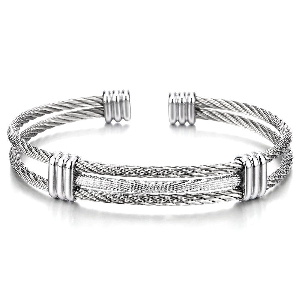 COOLSTEELANDBEYOND Men Women Stainless Steel Twisted Cable Adjustable Cuff Bangle Bracelet Silver Color