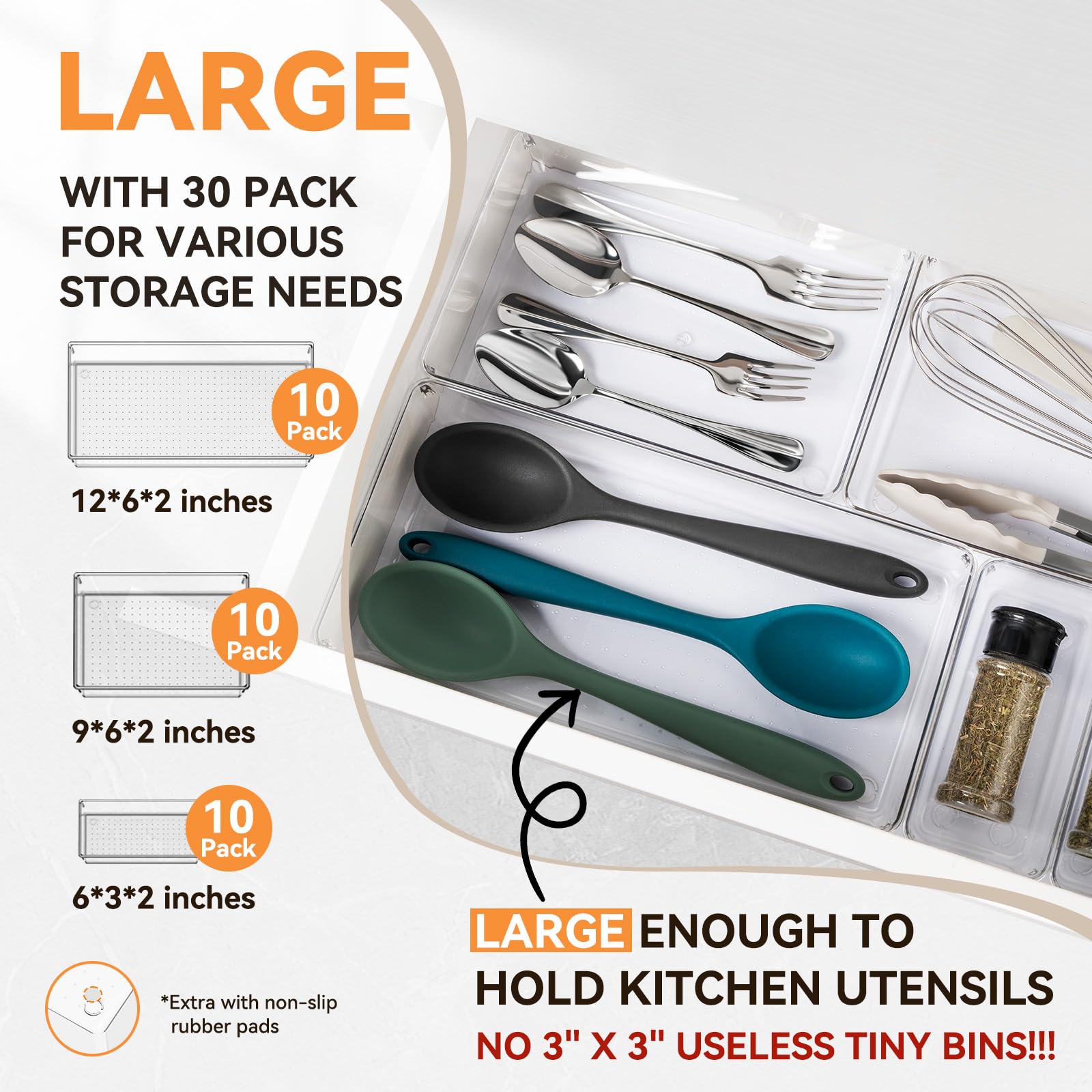 • 【LARGER SIZES】With 3 different sizes, our 30 pack clear drawer organizers could hold more gadgets, large and long enough to hold kitchen utensils, silverware, household tools and more. Includes: XL-12x6x2 inches(10pcs), L-9x6x2 inches(10pcs), M-6x3x2 inches(10pcs), Non-slip silicone pads(120pcs).