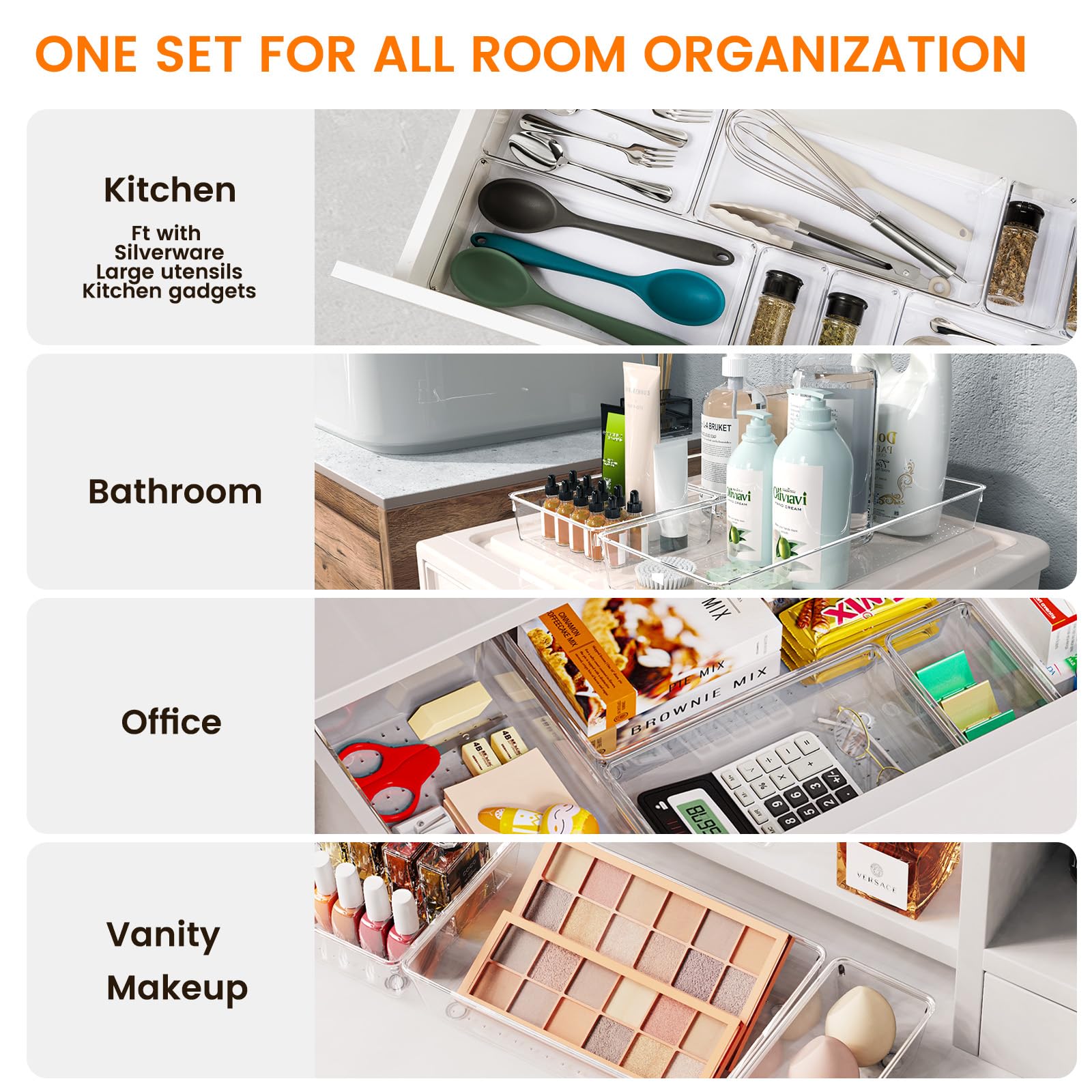 • 【FOOD-GRADE QUALITY】Crafted from premium PET plastic, our desk drawer organizers are twice as sturdy as other fragile ones, and resistant to cracks and scratches. No smells, and safe as food storage, refrigerator pantry organizer and storage. (If quality fails, we'll provide you with a new complete set.)