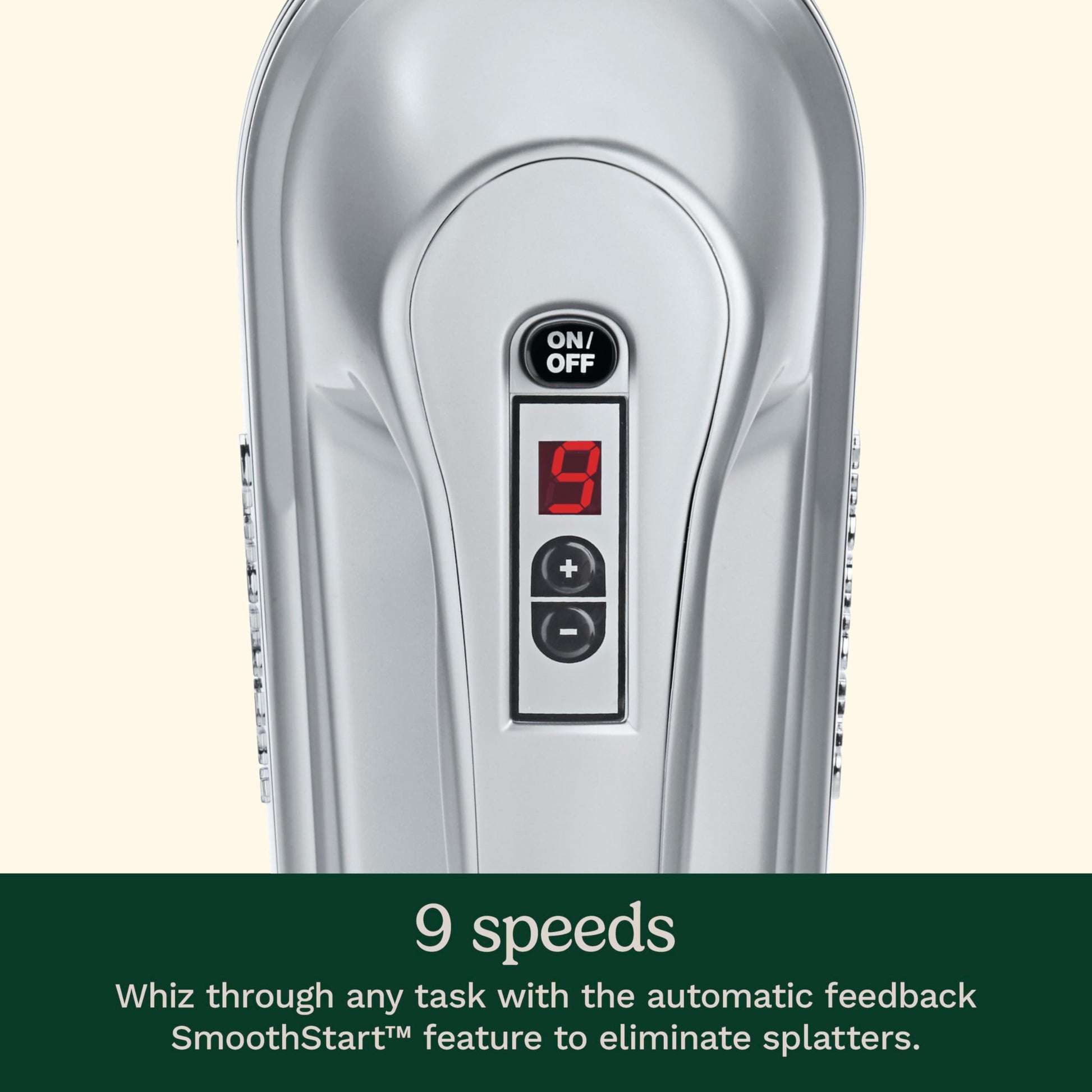 • SUPERIOR PERFORMANCE: The Cuisinart Power Advantage Plus 9-speed hand mixer has 220 watts of power with automatic feedback including SmoothStart feature with 3-low mixing speeds that eliminates splattering