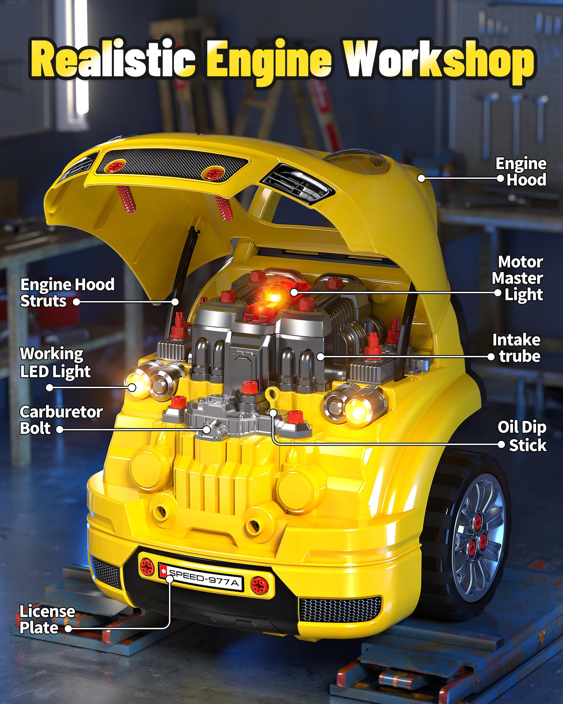 • 【Pretend Auto Service Station】 Take apart or assemble as needed. Open the engine cover, you can remove the engine parts, check the oil with the dipstick, and disassemble the engine. Working LED headlights, engine with lights and sounds. Car key with simulated lock, unlock/alarm and engine sound effects !