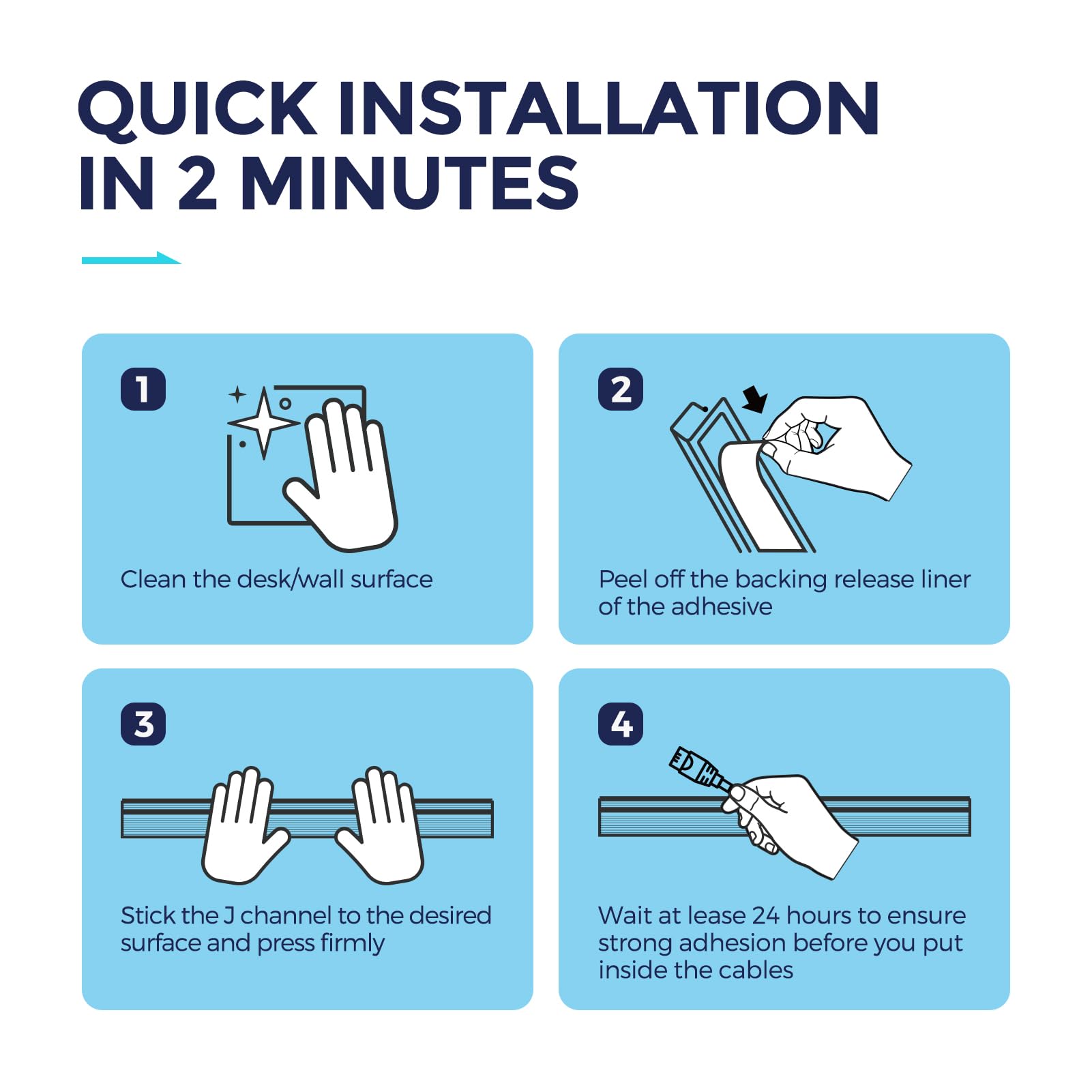 • 【Versatile Installation Options】Whether it’s managing cables under a desk, concealing wires in a corner, or storing cords on a desktop, this cord management can easily meet your needs. Note that adhesive tape of the cable raceway might not stick as well on powdery or uneven surfaces; for best bonding results, install the desk cable management and wait 24 hours before placing wires