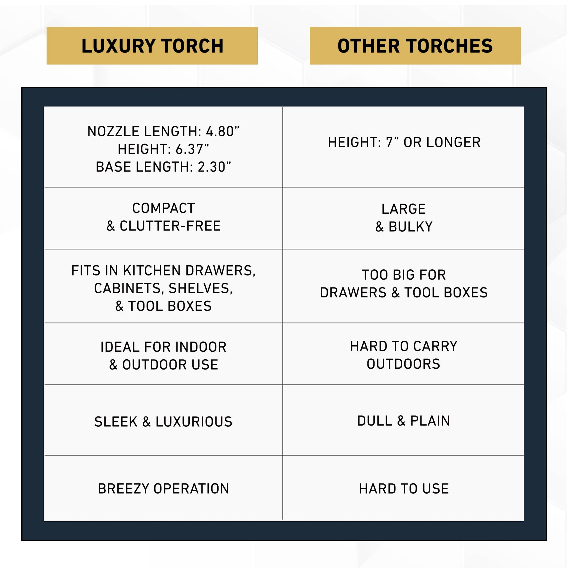 • A Luxurious Gift They Can’t Beat: Available in 4 sophisticated colors, our handheld kitchen torch for baking boasts a portable, sleek design that will look fantastic on your shelf or cabinet. This butane cocktail torch also comes in a deluxe gift box, making it a beautiful present to your fellow creatives.