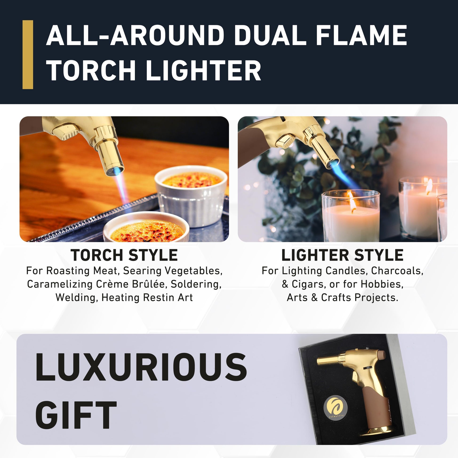 Dual Flame Butane Torch Gun - Refillable Luxury Hand Held Mini Blow Torch for Cooking, Creme Brulee, Soldering, Welding, & Resin Art - Adjustable Flame with Ignition Lock - Gold Brown by inZaynity