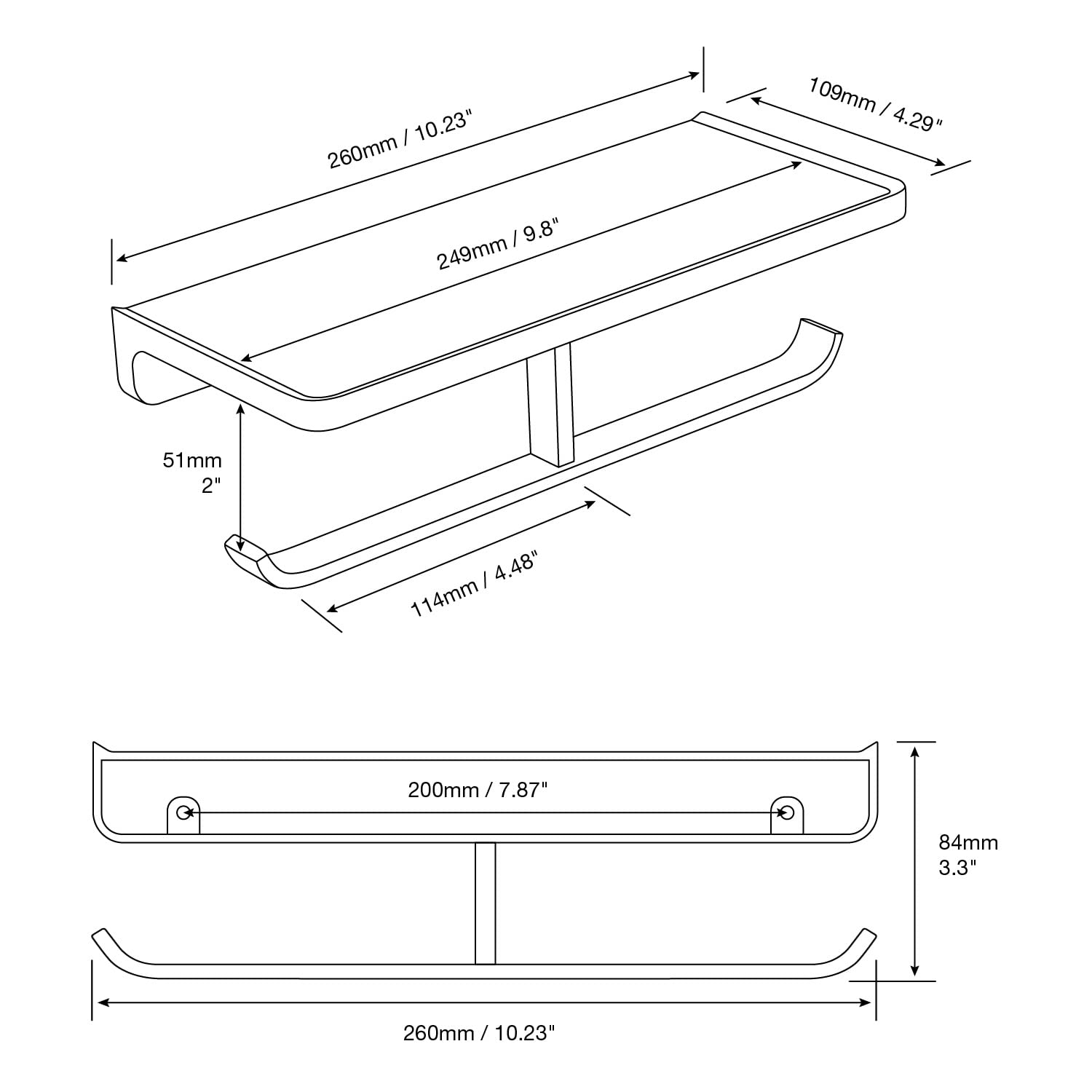 • MULTI USE, strong wall mounted toilet paper roll holder, plus multipurpose storage shelf! 10.2" by 4.3" top shelf is LARGE ENOUGH to hold various items on, e.g. cell phone, ipad, bluetooth speaker or other small electronics. Upward bend edge prevents phone or things from slipping off. 2 mounting hole distance 7.87" (200mm)