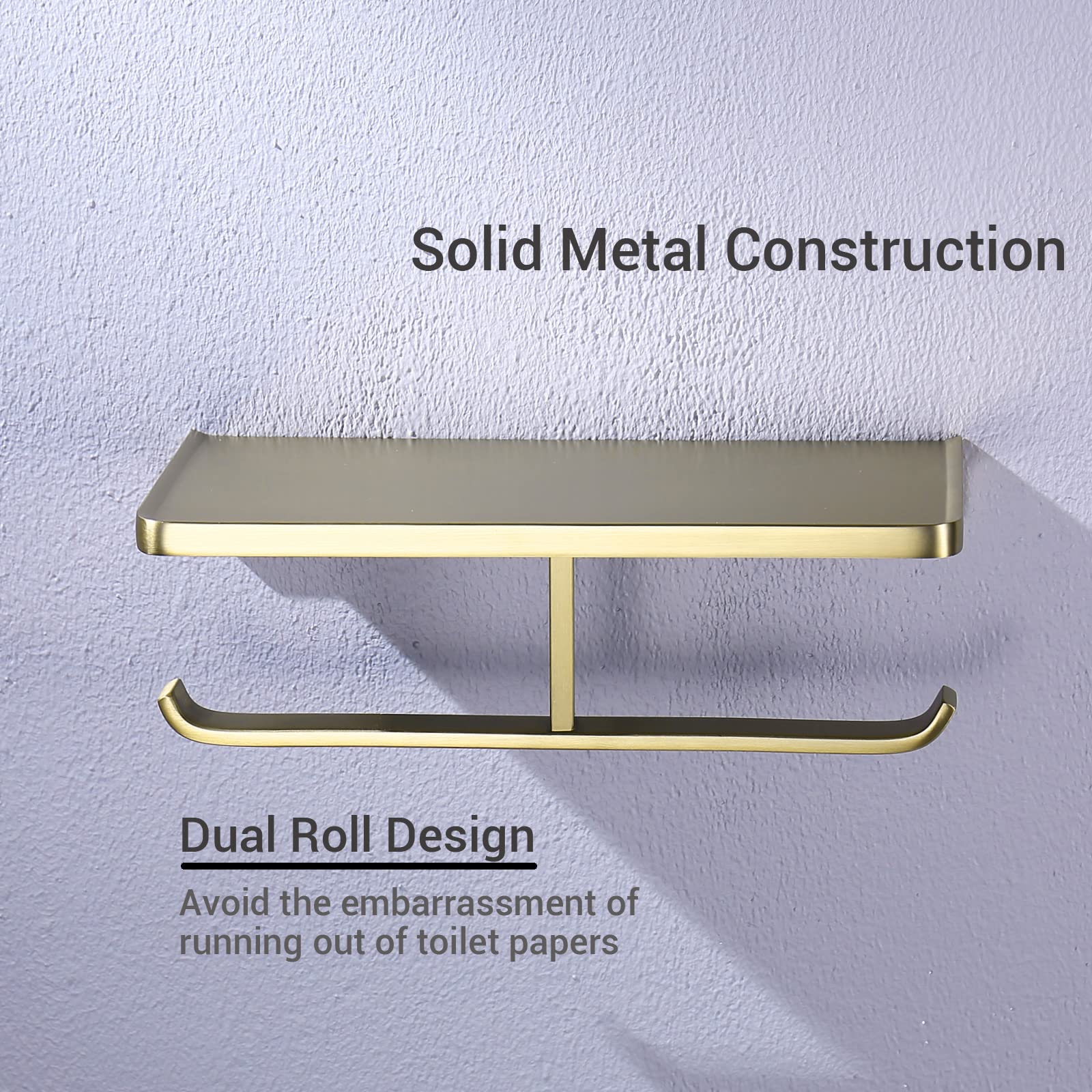 Dual Roll Toilet Paper Holder with Phone Shelf, Solid Metal Bathroom Accessory Tissue Dispenser Storage Wall Mounted, Spot Resist, Brushed Gold