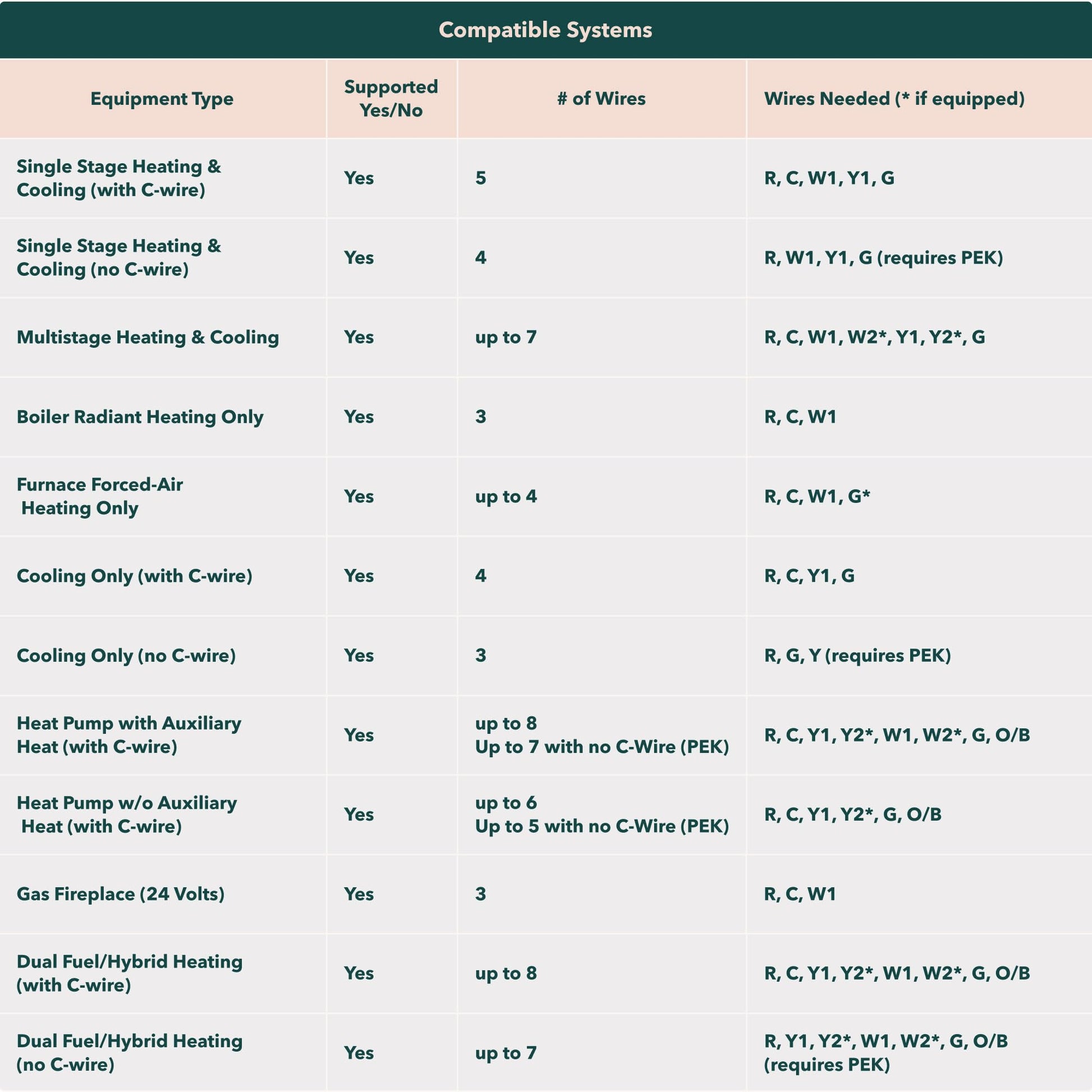 • Works with most 24 VAC HVAC equipment: Gas, oil, electric, dual fuel, forced air Conventional (2H/2C) Heat Pump (3H/2C), & Boilers. Includes Power Extender Kit for homes without a C or Common Wire, to ensure an easy installation