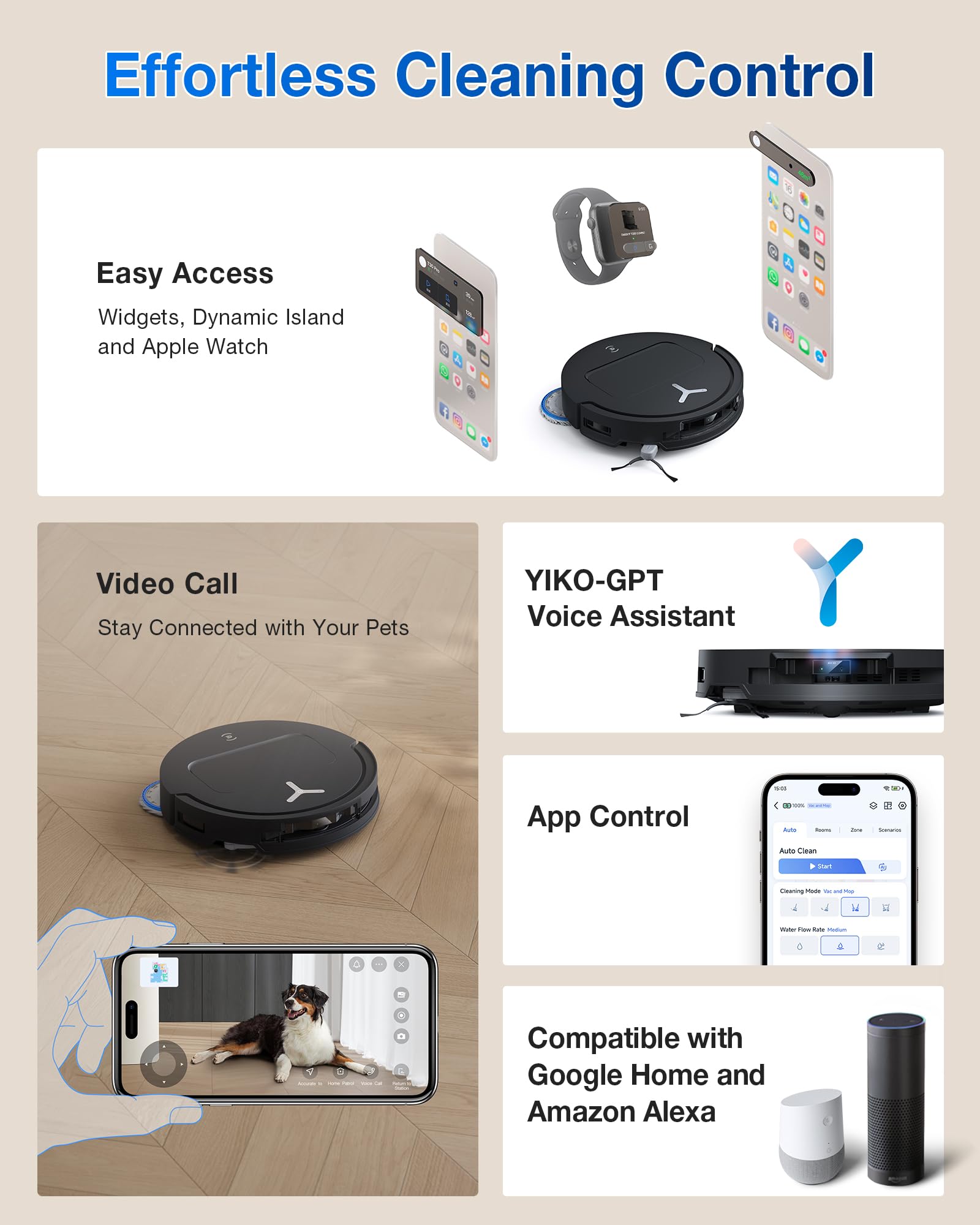 • SMART CONTROL WITH YIKO-GPT AI ASSISTANT - The YIKO-GPT AI Assistant enables natural voice and text commands, allowing you to control cleaning with ease. Whether through simple voice prompts or long-form interactions, YIKO-GPT understands your needs and responds intelligently, making home cleaning effortless.