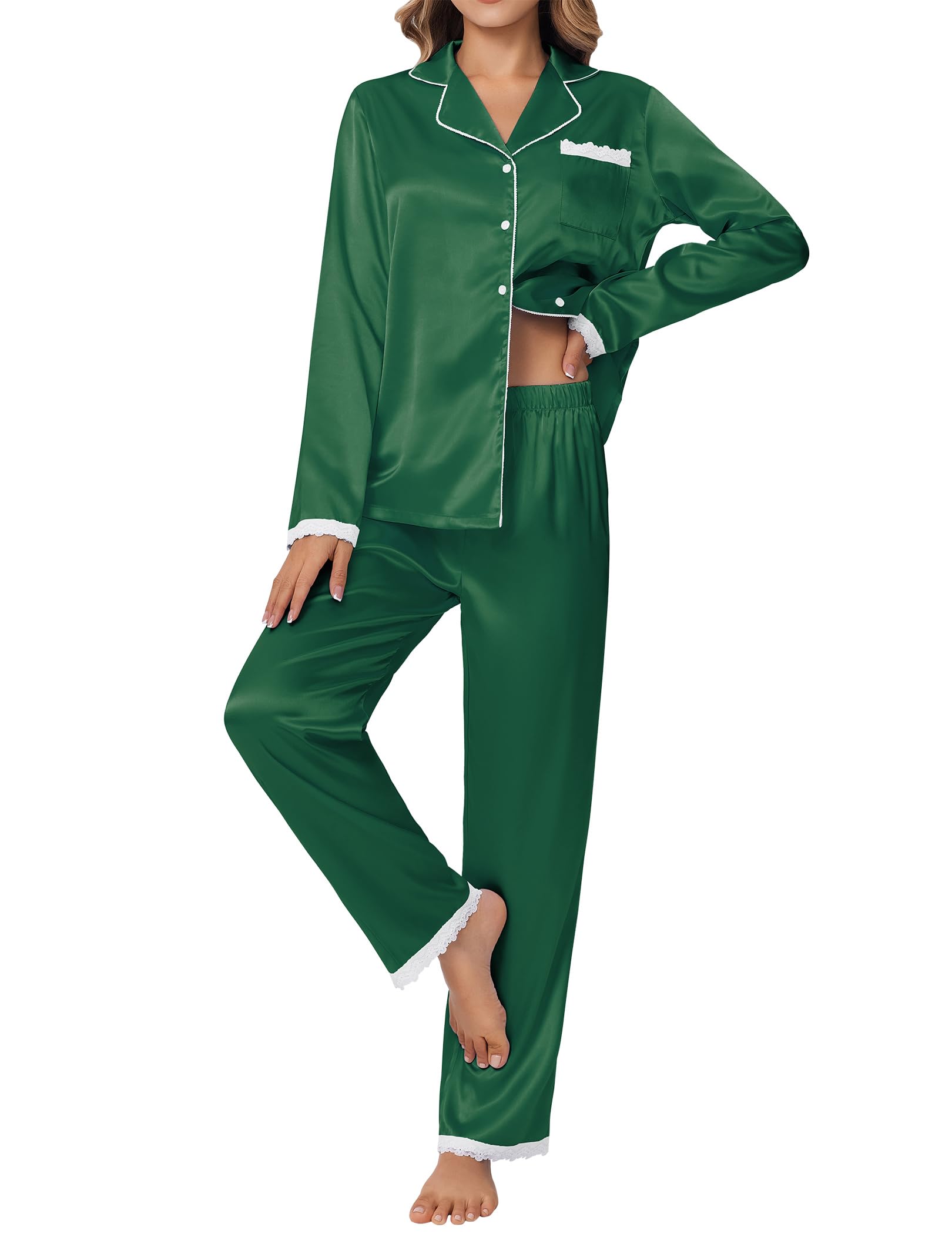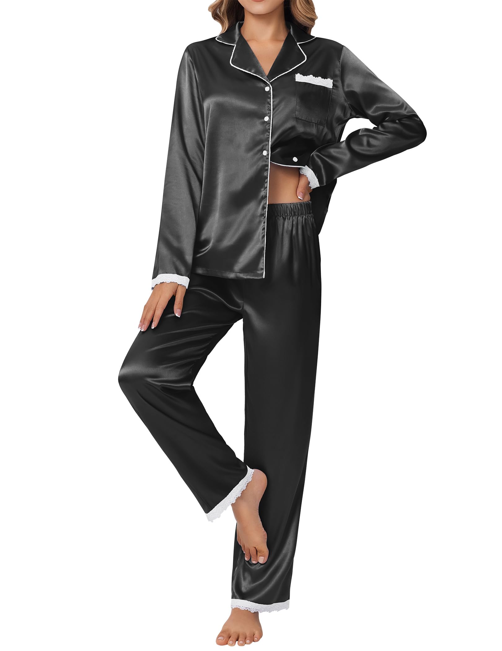 Ekouaer Satin Pajamas for Women Silk Long Sleeve Sleepwear Button Down Loungewear 2 Pieces Lace Soft Pjs Set