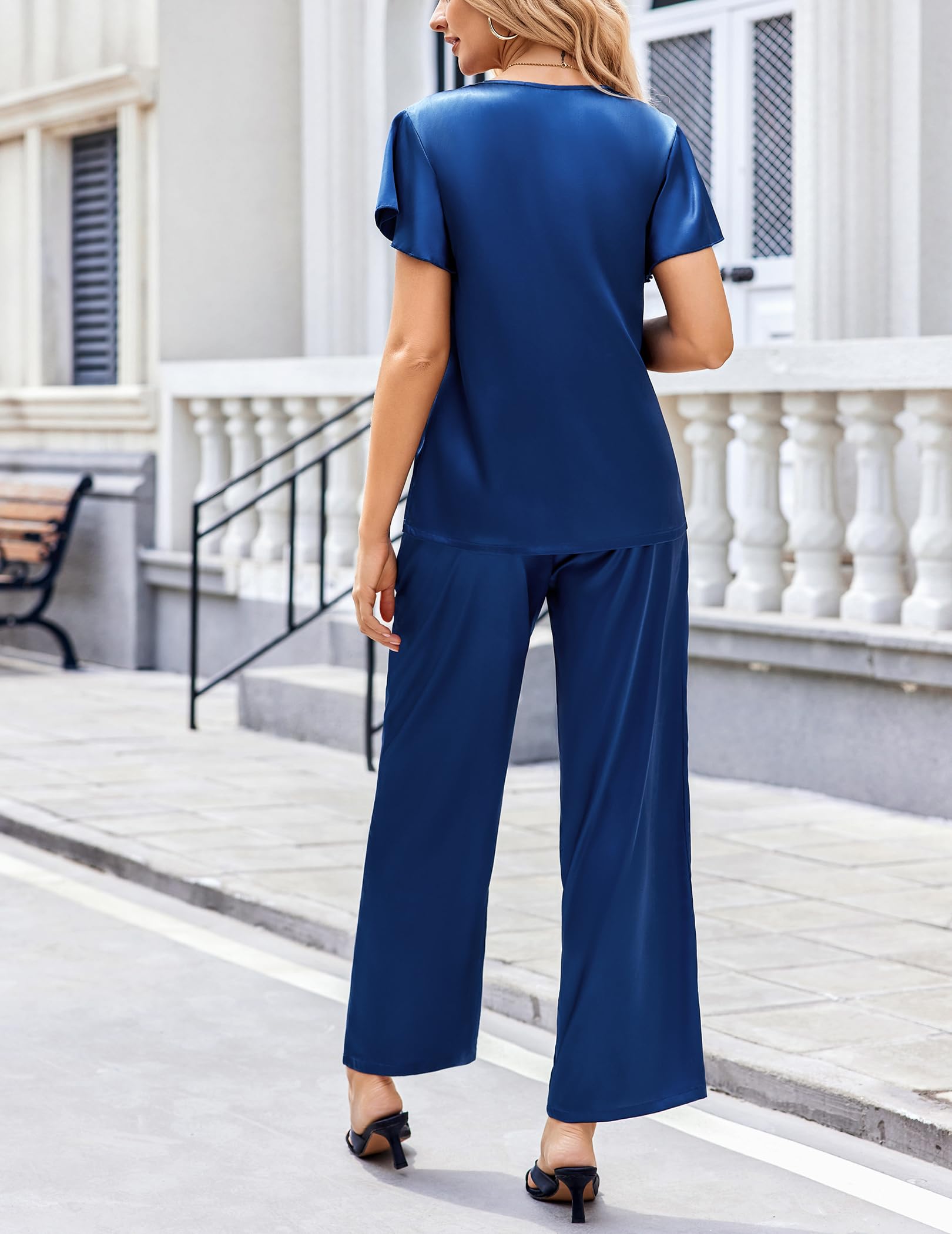 Ekouaer Women's Satin Silky Pajama Set 2 Piece Short Sleeve Shirt with Long Pants Pjs Sets Soft PJ Loungewear S-XXL