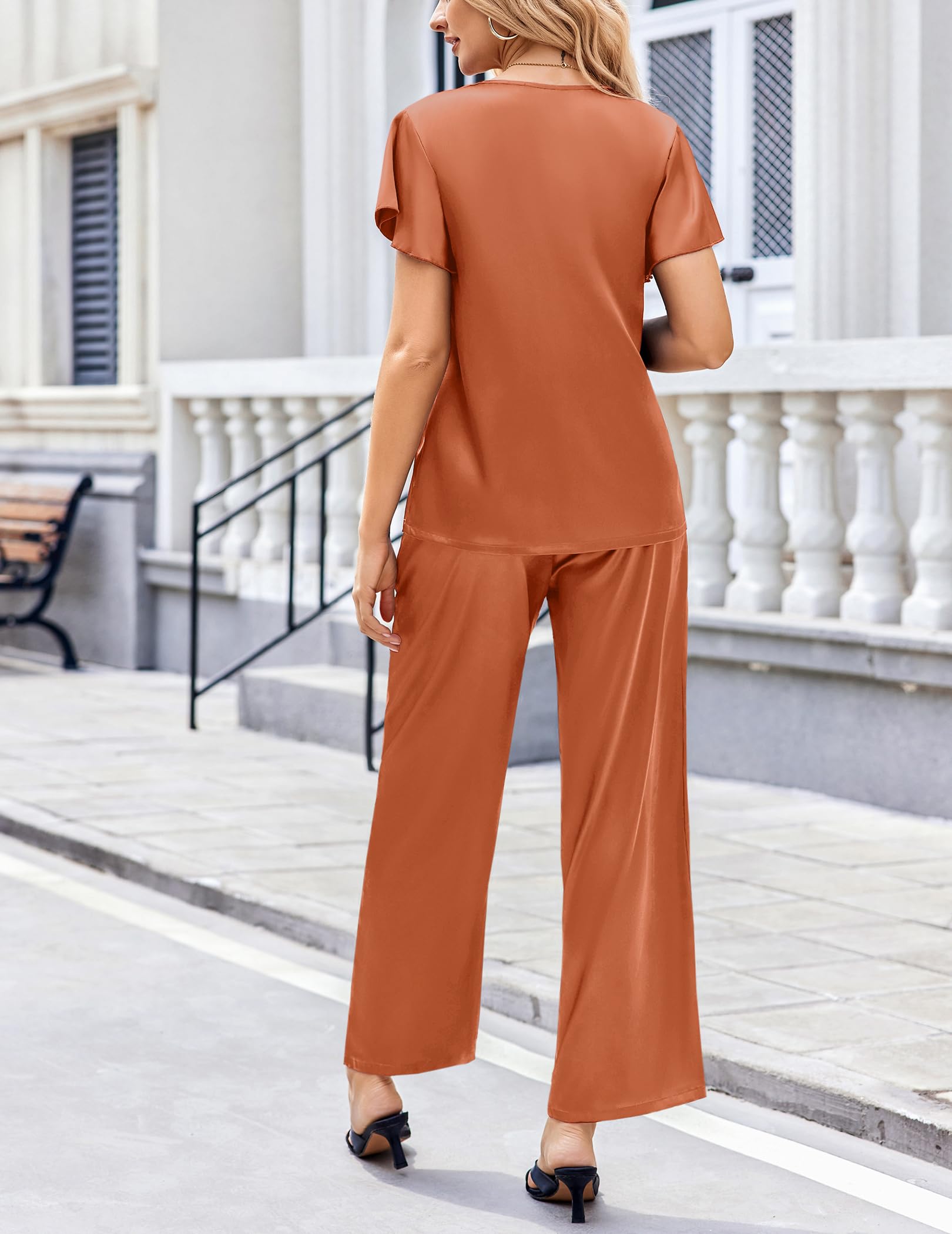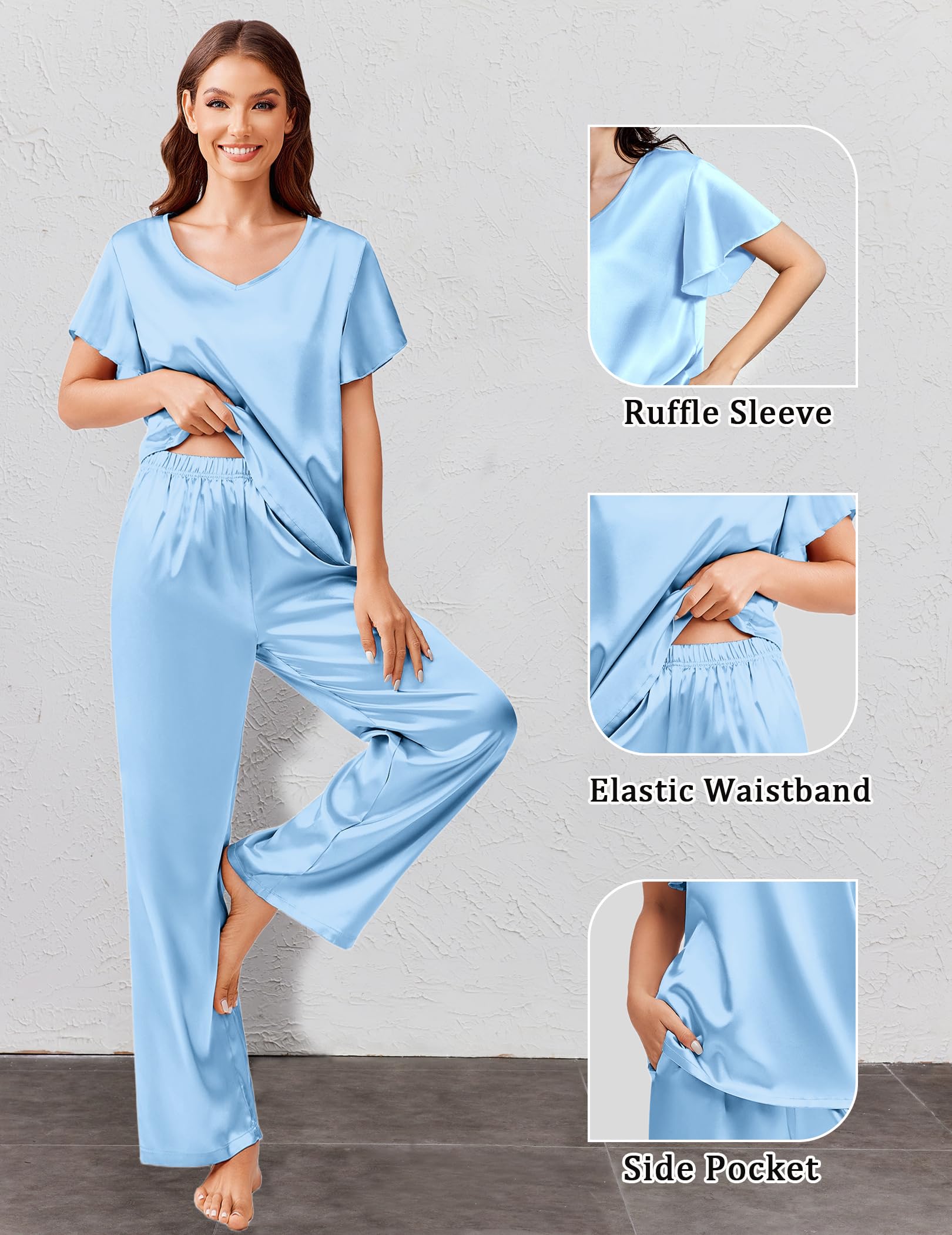 • DESIGN: Ekouaer satin pajama set for women features the loose fit, satin short sleeve t-shirt with ruffle sleeve and bottoms with elastic waistband, two pockets, and relaxed fit wide legs long pants