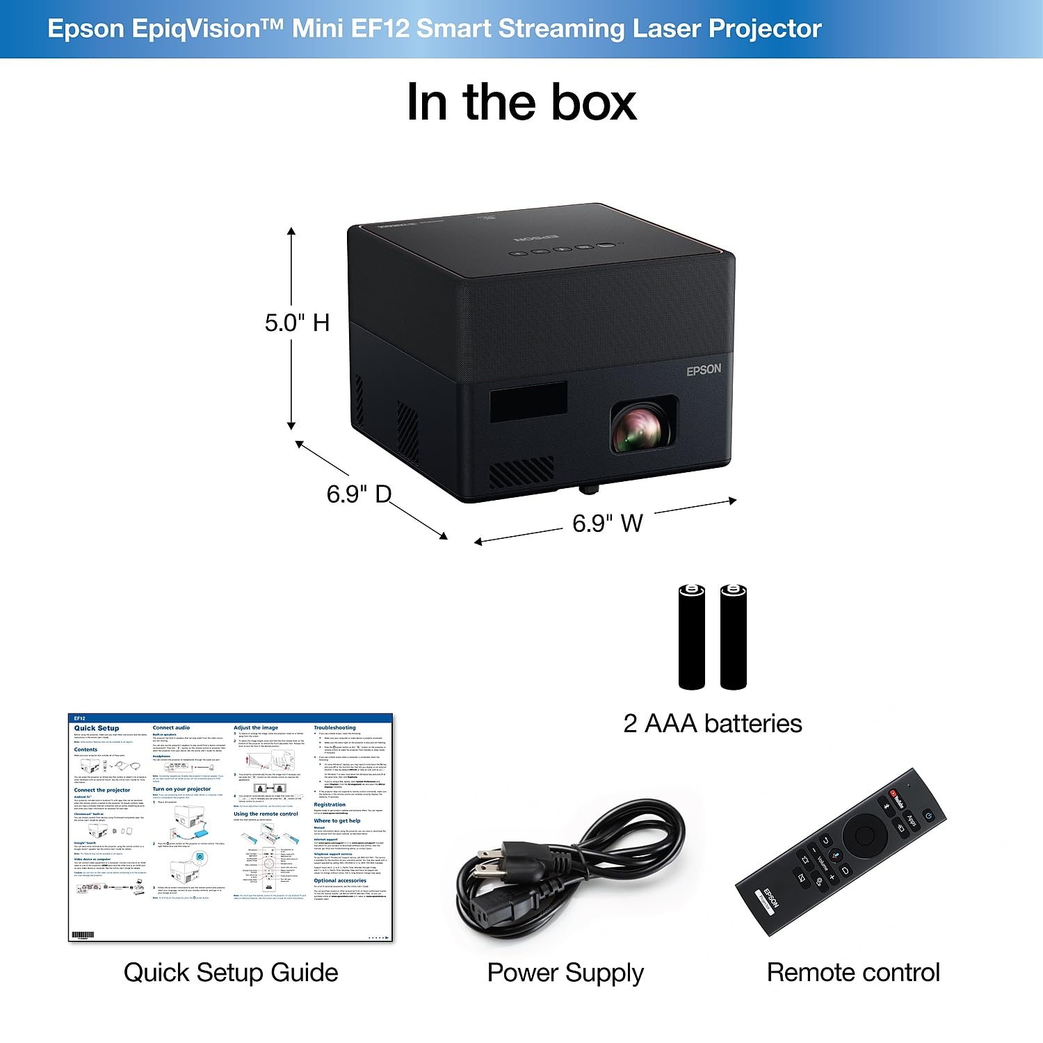 • Elegant Compact Design — Designed with simplicity in mind, the Epson EpiqVision Mini EF12 Streaming Laser Projector has a clean, compact and modern design to beautifully fit within any décor.