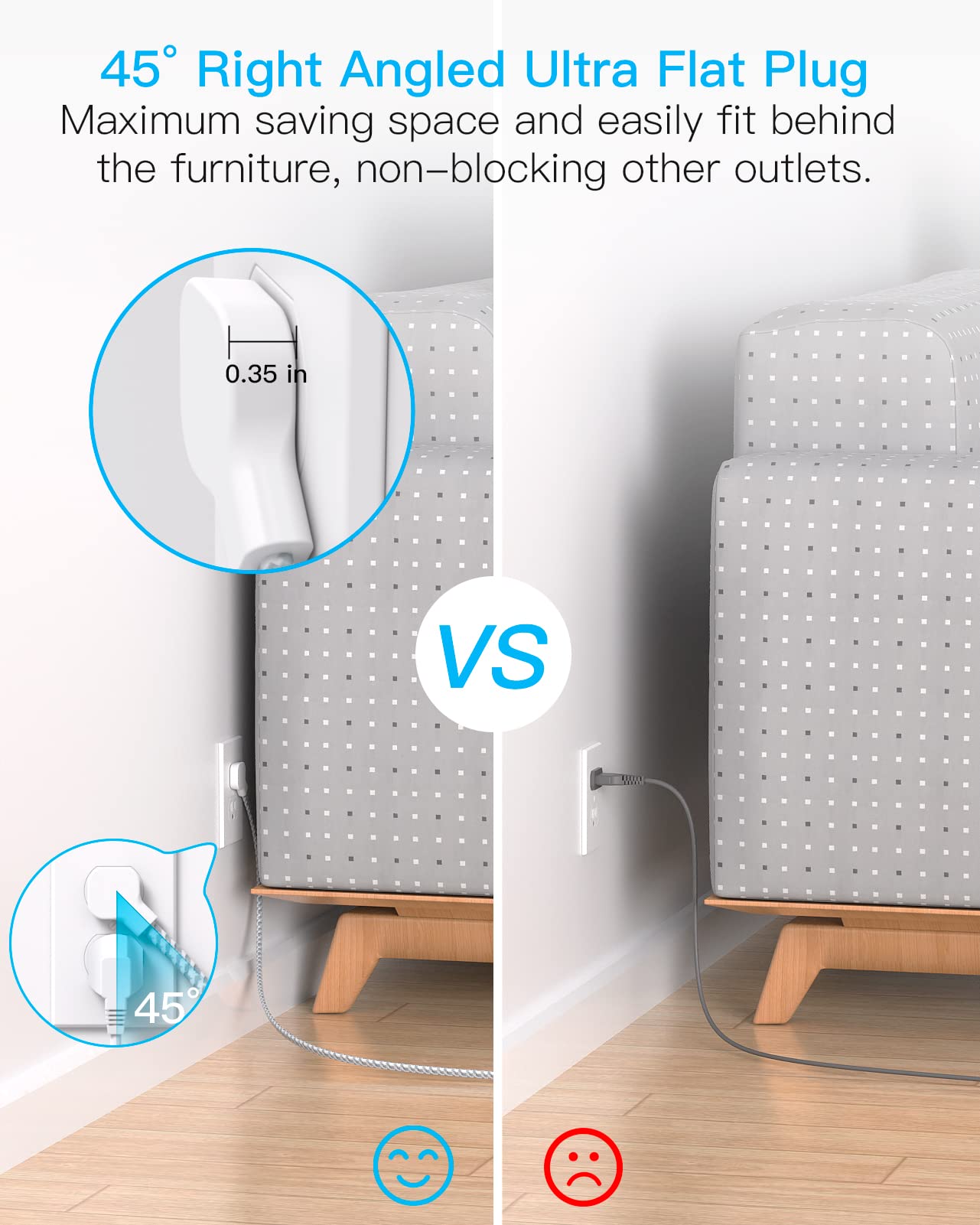 • 【Right Angle Ultra Flat Plug & 5 Ft Braided Extension Cord】 - With only 0.35 inch ultra thin plug and 45 degree right angle design, which is much slimmer than traditional plugs, can close to the wall easily and hide in the back of furniture, no waste for outlet and space. 3mm thicker extension cord is made of pure copper, which has better current carrying capacity (15A). The braided power cord is not easy to deform, durable and more safety.