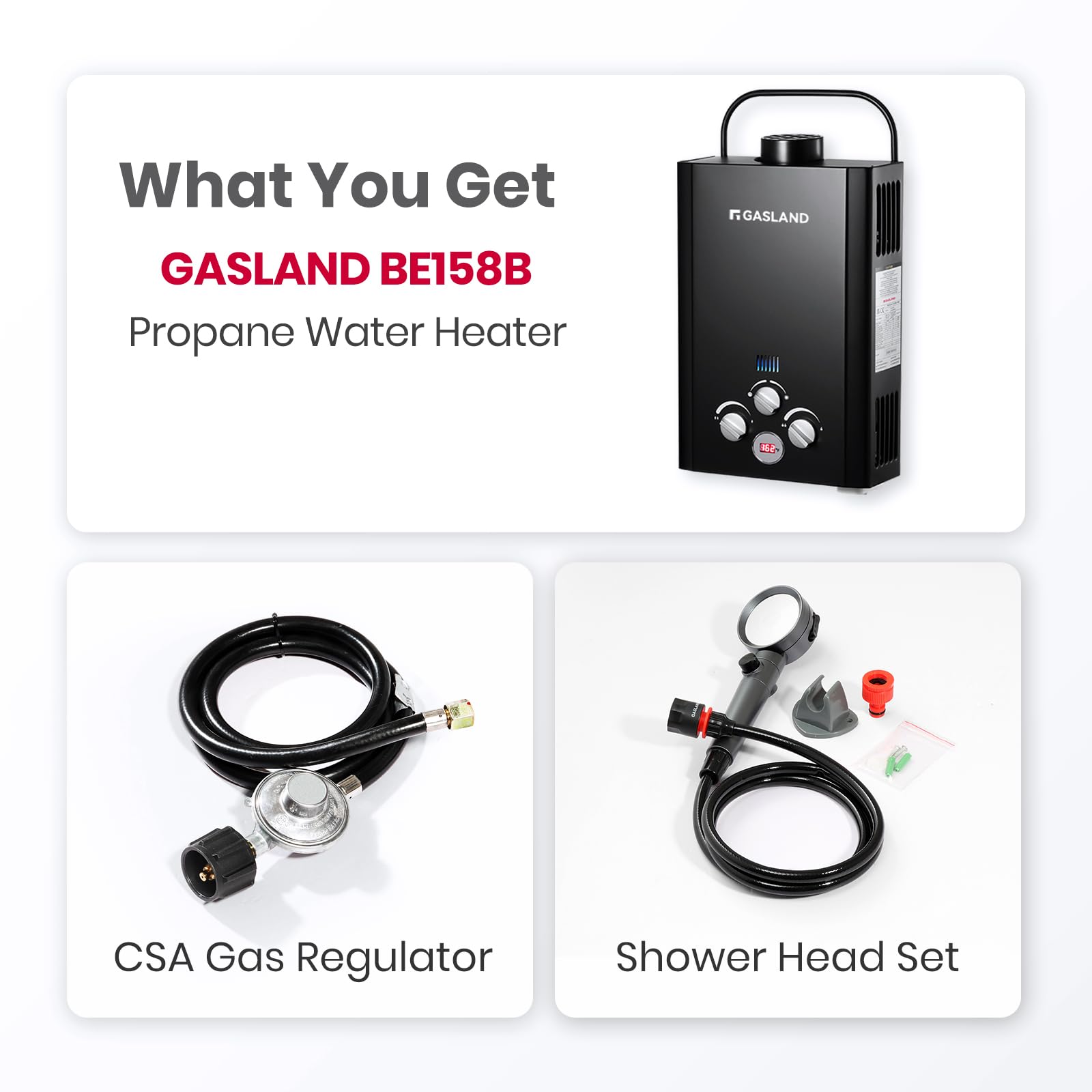• ๐—ช๐—ต๐—ฎ๐˜'๐˜€ ๐—œ๐—ป๐—ฐ๐—น๐˜‚๐—ฑ๐—ฒ๐—ฑ - GASLAND BE158 Tankless Water Heater CSA certified gas regulator and hose 5 feet On/Off Switch Shower Head mounting hardware garden hose adapter Manual.