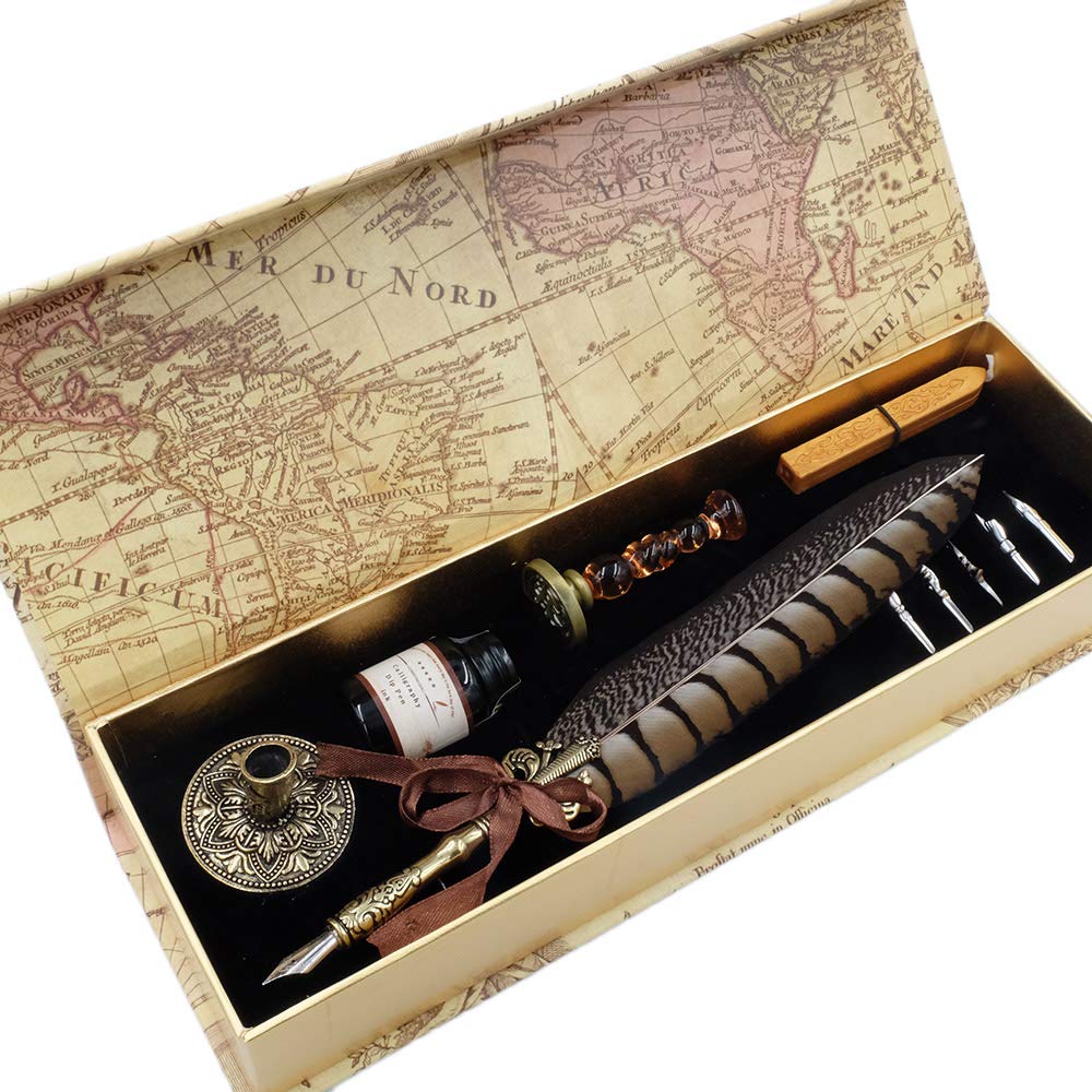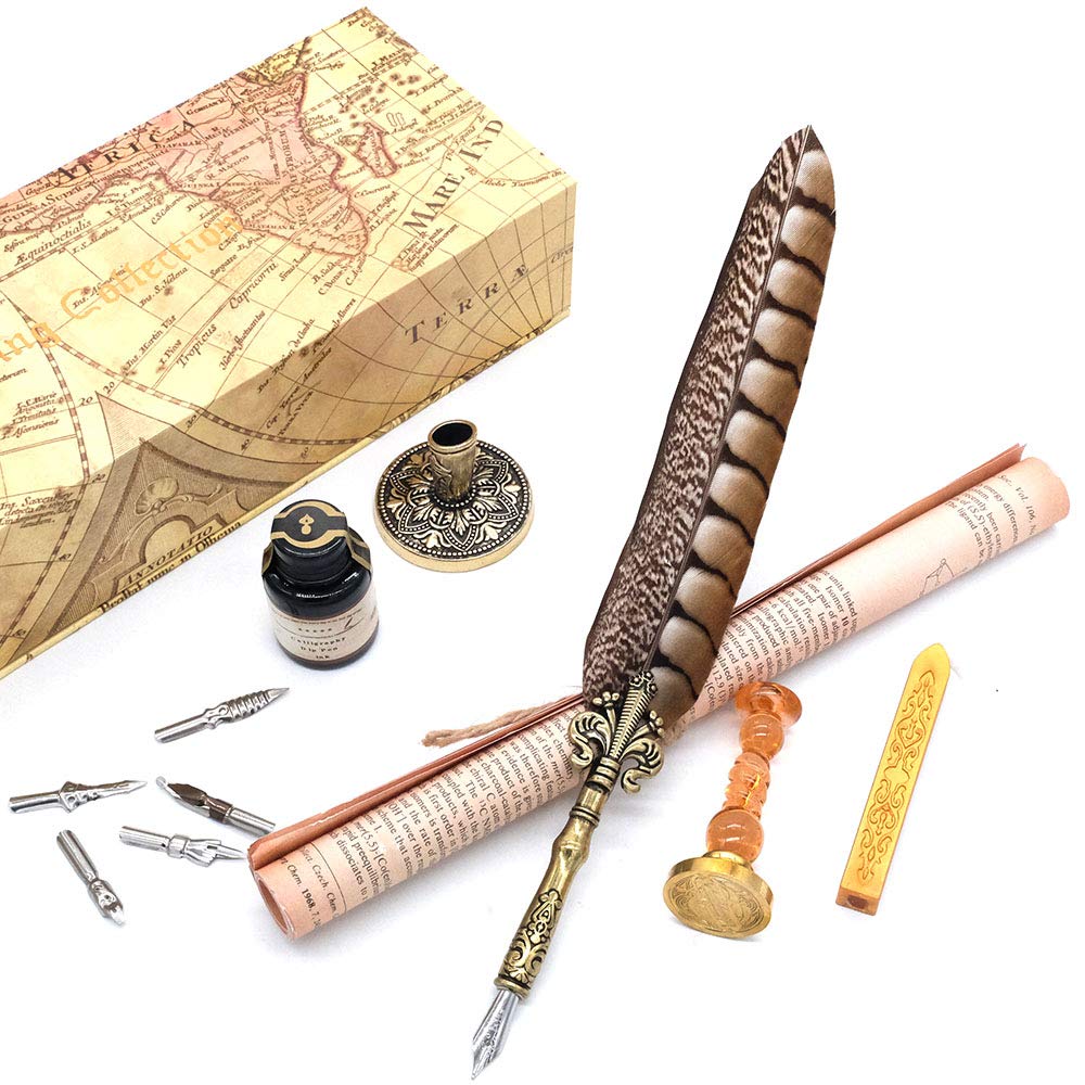 GC QUILL Antique Quill Pen Unique Half-Patterned Feather Pen Set with 6 Nibs 1 Bottle of Ink 1 Seal Stamp 1 Pen Holder 1 Sealing Wax LL-149