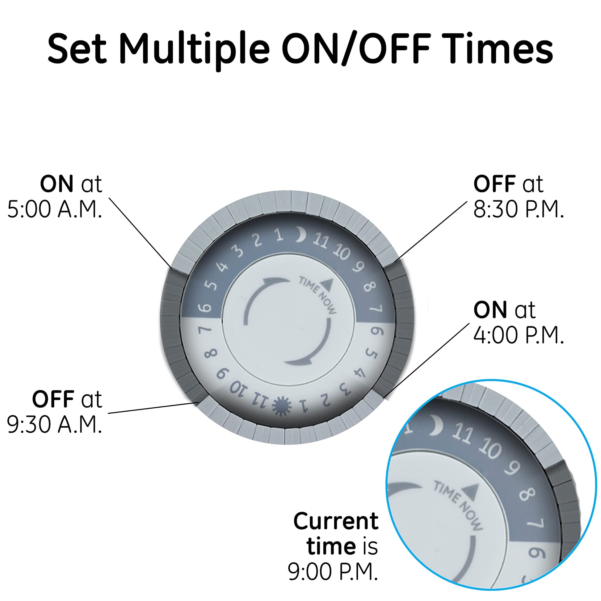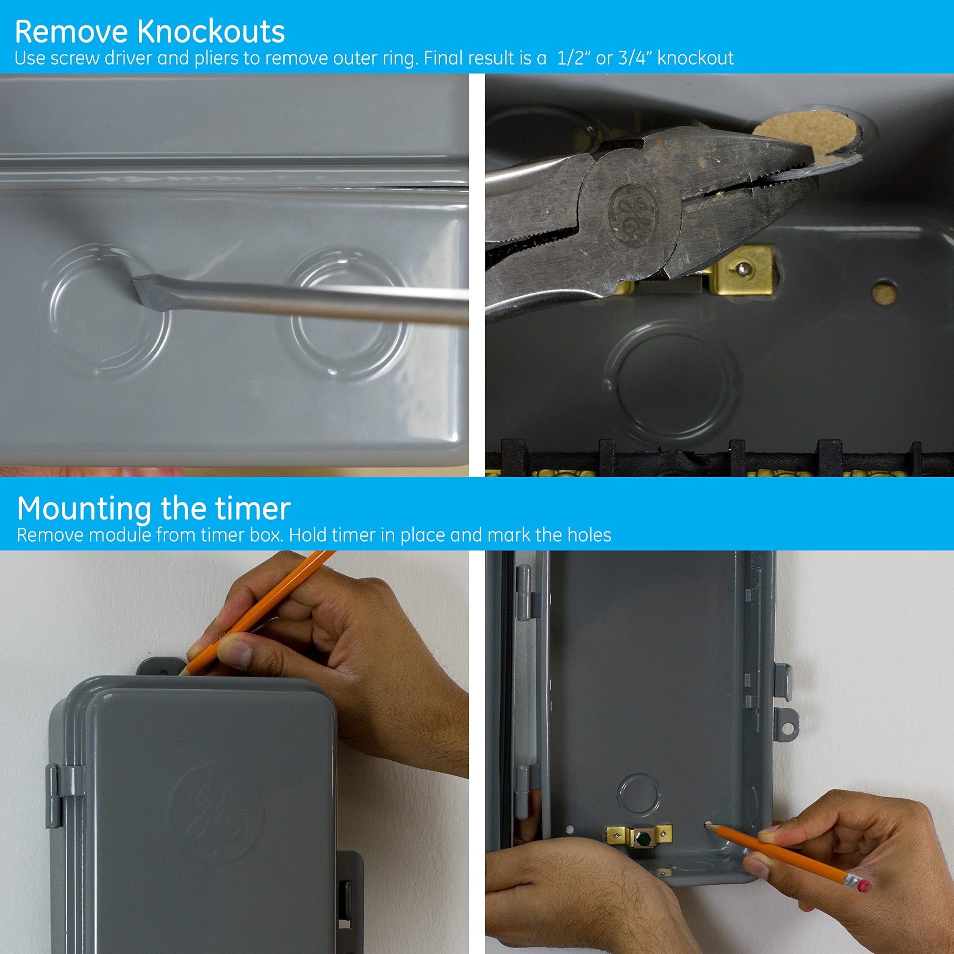 Details: Schedule your day with the GE-branded 24-Hour Mechanical Time Switch. The heavy-duty box timer is perfect for fans, pumps, pool heaters, AC units, heating and ventilation systems, and more. For increased versatility, it is compatible with LED, CFL, incandescent and halogen bulbs. The single-pole single-throw time switch supports 120-277VAC systems up to 2HP and up to 40A. Convenient and secure block terminals support fast, easy wiring of large-load equipment. Turn your devices ON/OFF several times over a 24-hour period using 30-minute interval push pins. A simple dial on the face of the timer supports less complicated set up compared to complex automation devices. A manual override switch allows complete control of your appliances with easy ON and OFF operation. The rugged NEMA-3R metal enclosure is rainproof, tamper resistant and lockable for reliable outdoor installation. Stamped 1/2in. and 3/4in. knockouts and convenient mounting holes accommodate a variety of installations. Manage your home’s large appliances with the GE-branded 24-Hour Mechanical Time Switch.