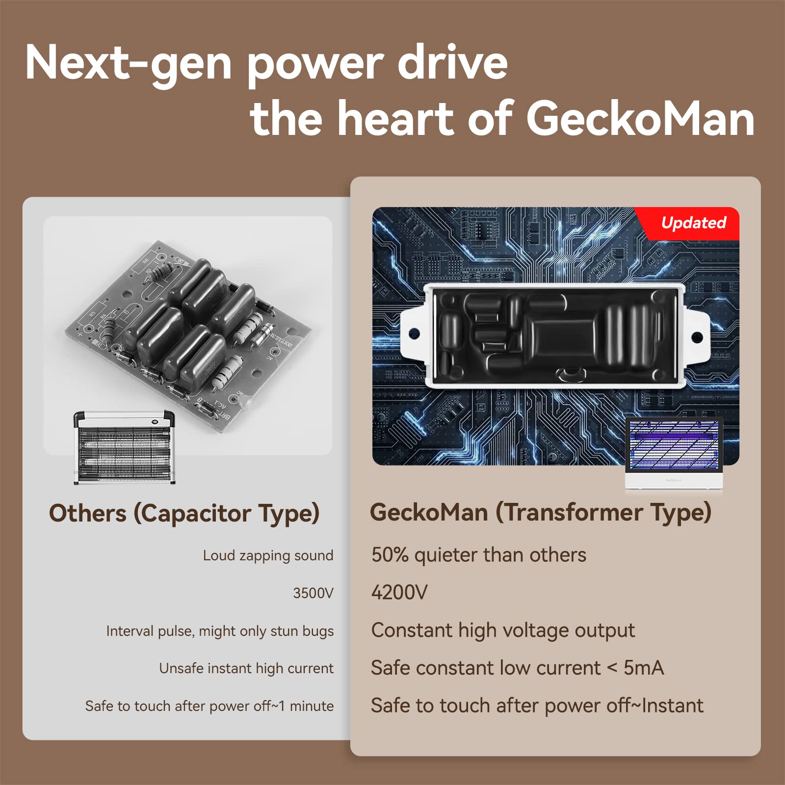 • 【⚡ More Powerful】Next generation power drive module generates and maintains a constant 4200V zapping power. Higher bug killing rate compared to other mosquito zappers (capacitor type) that can only generate interval zapping.