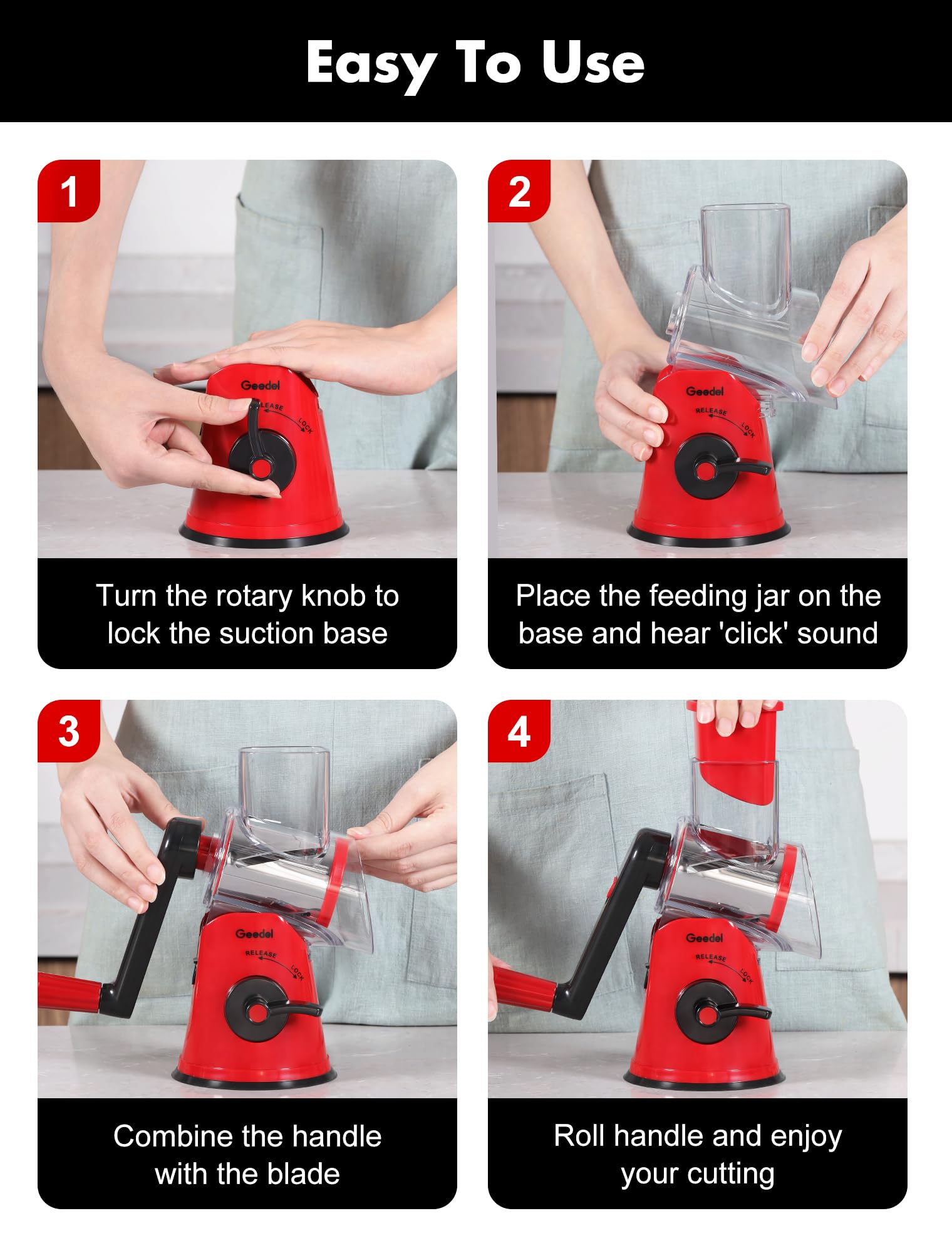 Geedel Rotary Cheese Grater Cheese Shredder - Upgraded 5-in-1 Cheese Grater with Handle and Strong Suction Base, Multi-purpose Vegetable Slicer Ice Shaver Nuts Grinder for Ice, Vegetables, Fruit, Nuts