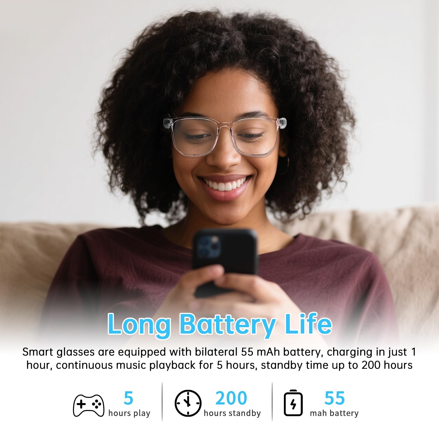 • 【 Open Ear Audio Glasses】5.3 Bluetooth glasses for women are designed with open high quality speakers, AAC audio decoding technology, 3D stereo sound, clear binaural calls just like face-to-face communication. This audio glasses women won't have earache or headphone heating feeling even after long time wearing.