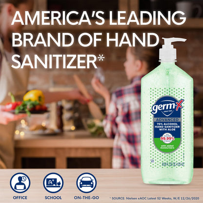 • Fast and Effective: Cleaning on the go just got a lot easier. Germ-X Advanced Aloe Hand Sanitizer gel kills 99.99% of germs without water in as little as 15 seconds