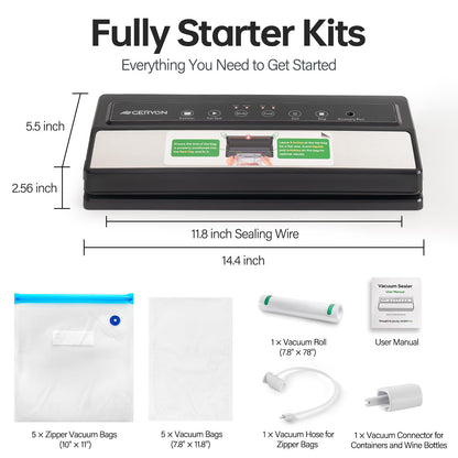 • 【Complete Starter Kit】An affordable option for beginners, including 5 heat-seal bags (7.8" × 11.8"), a vacuum roll (7.8" × 78"), 5 reusable zipper bags (10" × 11"), an external air suction hose for zipper bags and canisters, a food vacuum sealer machine, a user manual, and a power cord.