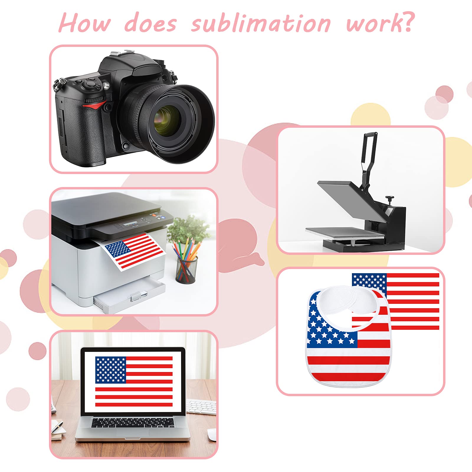 • Sublimation design: printing parameters are 392 degrees Fahrenheit, 40 seconds, you can print festival or party patterns on the surface, making the bib trendy and popular, adding more fun to lovely little one, and also you can share your achievements with your friends who have babies