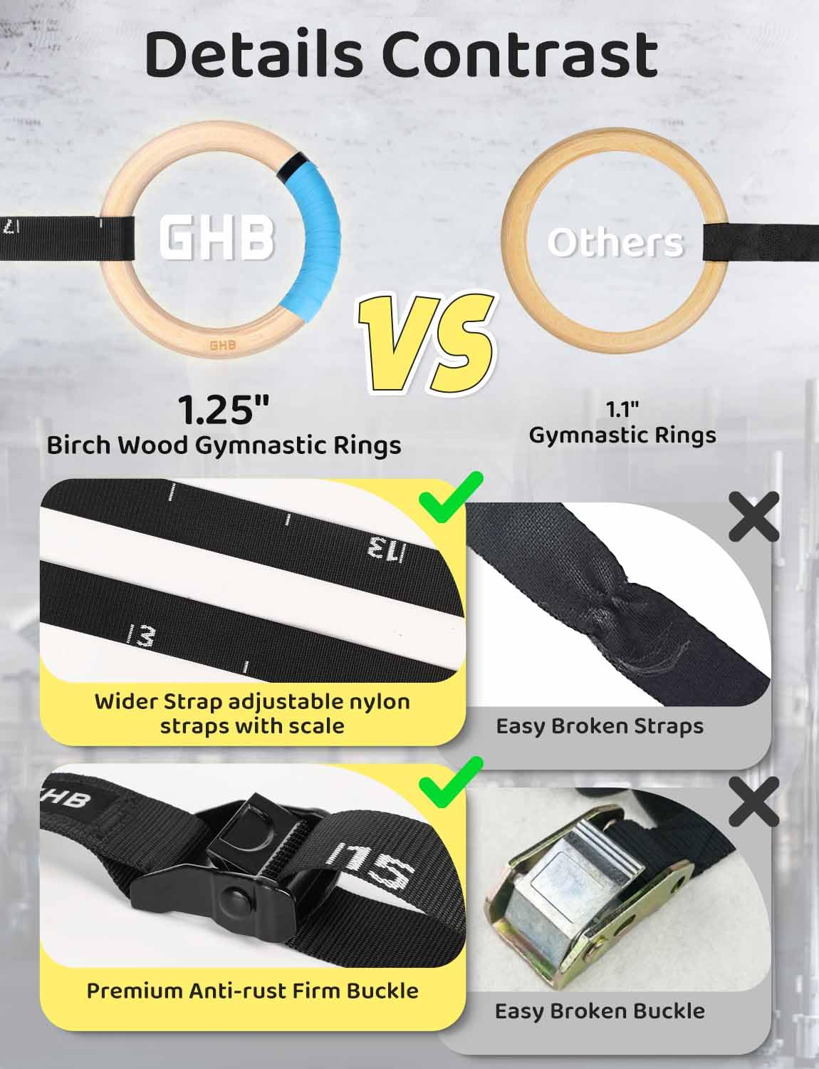 • (Ultra-high Load-bearing Performance 1.25" Olympic Rings) The exercises gymnastic rings are made of birch wooden 1.25",which is wide for comfortable grip,better than previous 1.1".GHB pull up rings have great load-bearing capacity and stronger