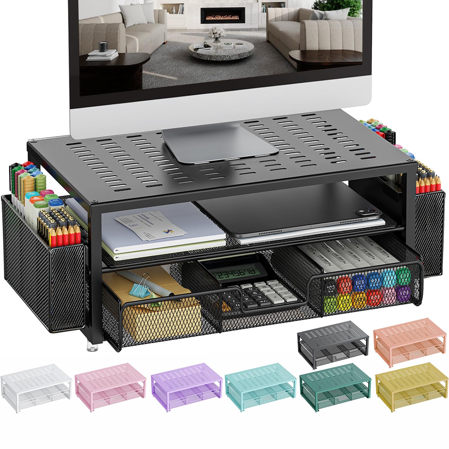 gianotter Desk Organizers and Accessories, Monitor Stand with Drawer and 2 Pen Holder, Desktop Organizer Suitable for Offices and Dormitories(Black)
