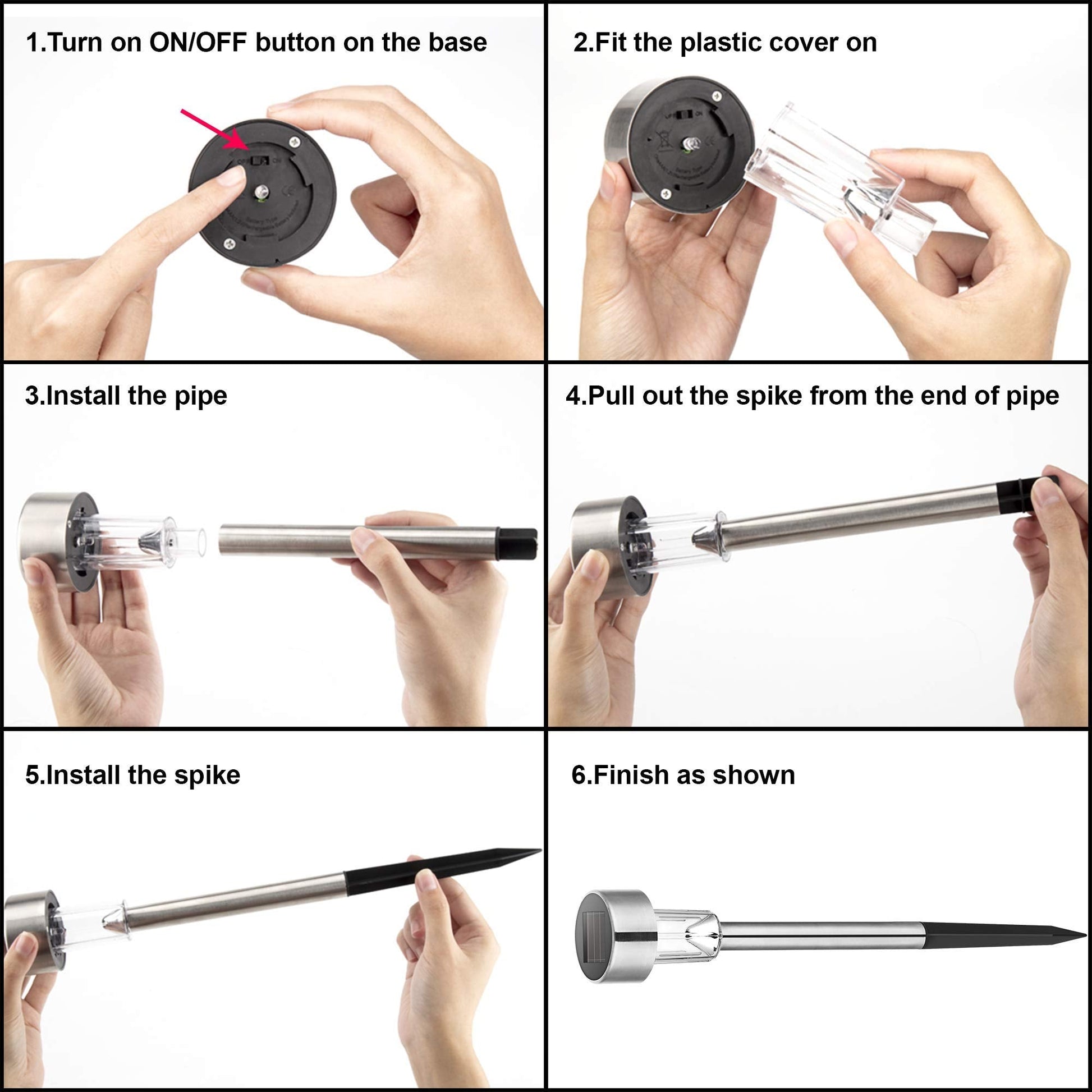 • [EASY INSTALLATION]: No tools and external wires. Put together each part of the solar garden light, and then push the stake into the soft soil. If the soil is quite solid, we recommended you make a hole on the ground before inserting the stake