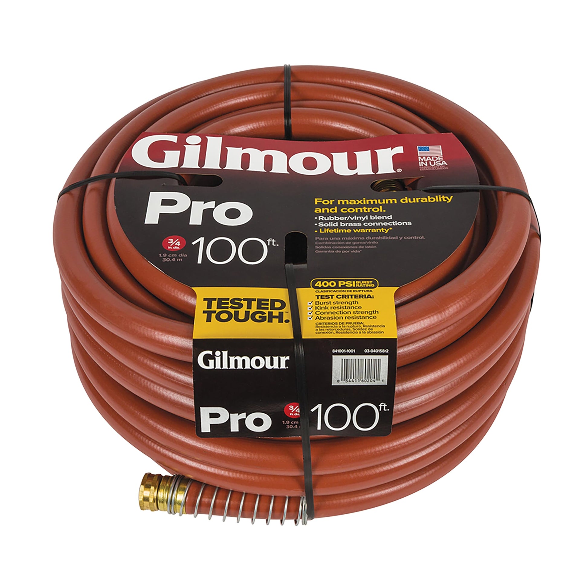 The Gilmour Pro commercial 3/4' x 100' heavy duty water hose is made of double-reinforced, commercial grade rubber and vinyl with a rugged, abrasion-resistant red cover that won’t mar surfaces. 100' long garden hose is built to tackle tough tasks and terrain and will hold up to the roughest jobs and weather conditions. Its heavy-duty brass couplings with O-rings provide a tight, durable seal every time, and a long-lasting protective steel spring coil prevents kinks at the spigot. This outdoor hose has undergone rigorous testing to ensure its able to tolerate water pressure fluctuations, rough and rocky terrain exposure to the elements. Any professional gardener will tell you, the right tools can make a world of difference when maintaining your lawn or garden. Trust Gilmour to provide reliable, comfortable watering solutions to turn any day into a betterday.