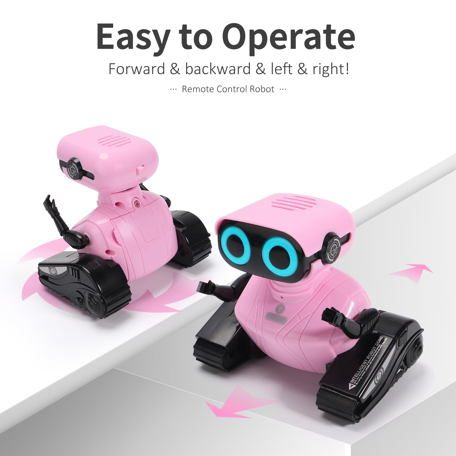 • Unique Design: The robot toy is design in 2 part. The upper part is a cute robot with LED eyes and flexible arms, which can make different postures. The bottom part is tank tracks, which can slide left and right and rotate 360° in place
