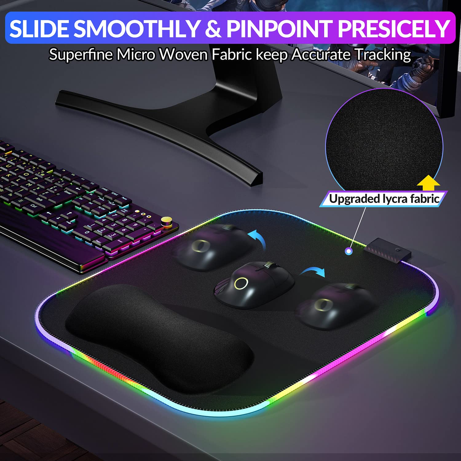 • [Smooth Surface for Precise Tracking, Non-slip Rubber Base to Grips Firmly While Gaming] The premium texture and ultra-smooth Lycra surface of the Led gaming mouse pad tracks mouse movement more accurately, ensuring precise positioning during gaming; fits all types of wired, wireless, optical and mechanical mice; the non-slip natural rubber base is non-toxic; the unique groove texture on the back increases friction and keeps the mouse pad firmly in place,allowing you to focus on work or gaming