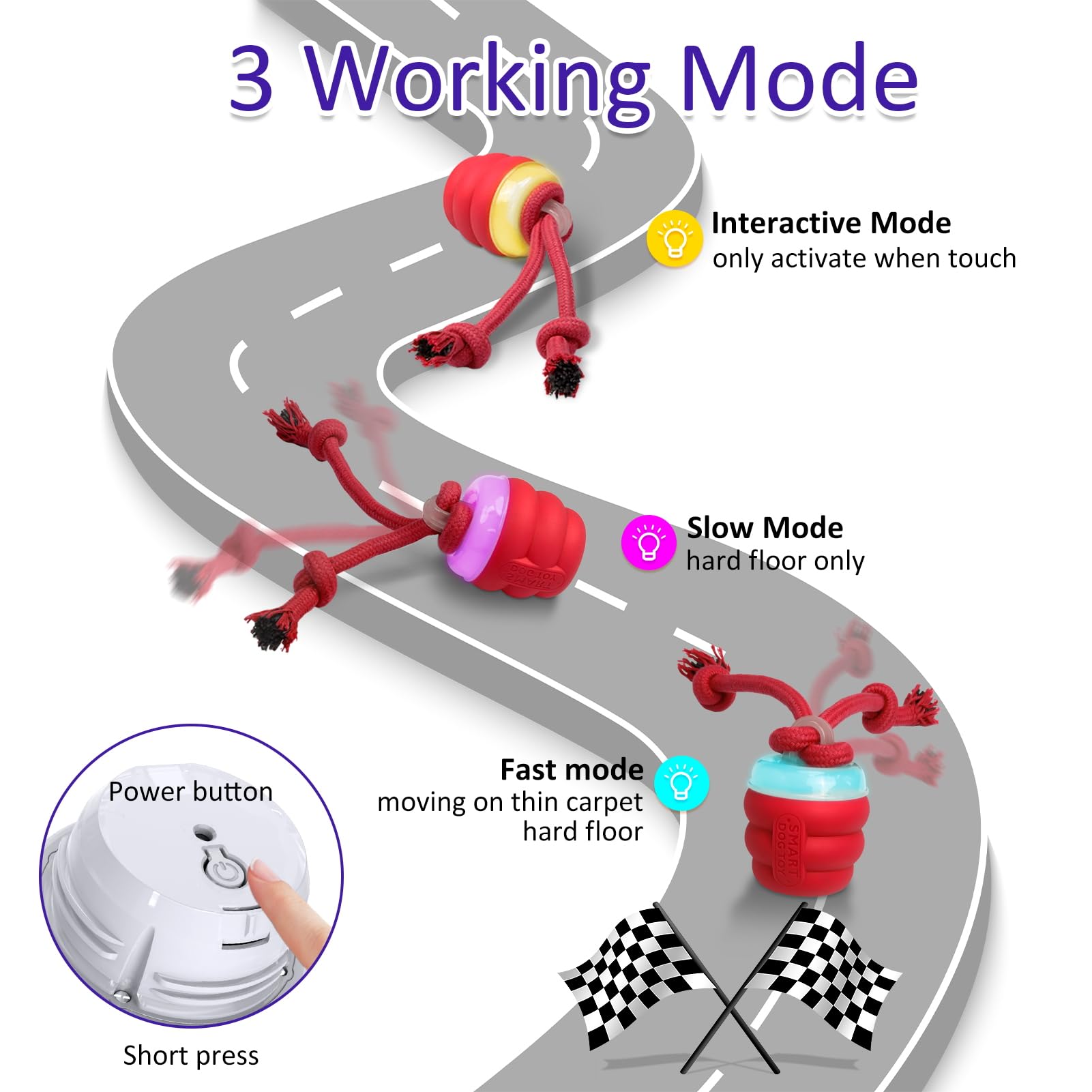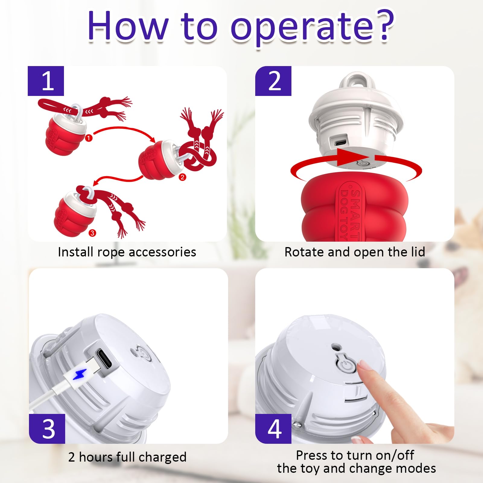 • How to use? Screw out the outer case to see the power button. Press first, power on and dog ball rolls in fast mode(blue light), change working mode by short press. Slow mode(purple light),Interactive mode(yellow light).Add the stronger rope on help balls rolls well, or you could DIY others special tails