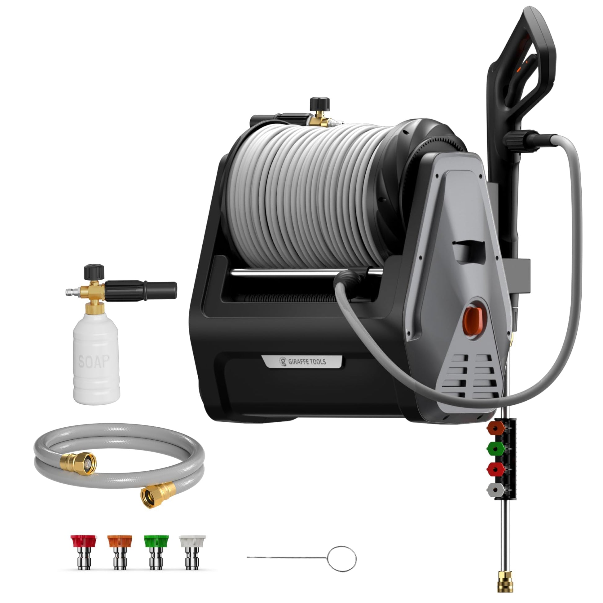 • Any Length Lock: Giraffe Tools power washer is pre-installed with a 100 ft retractable hose, which can lock at any length as you desired