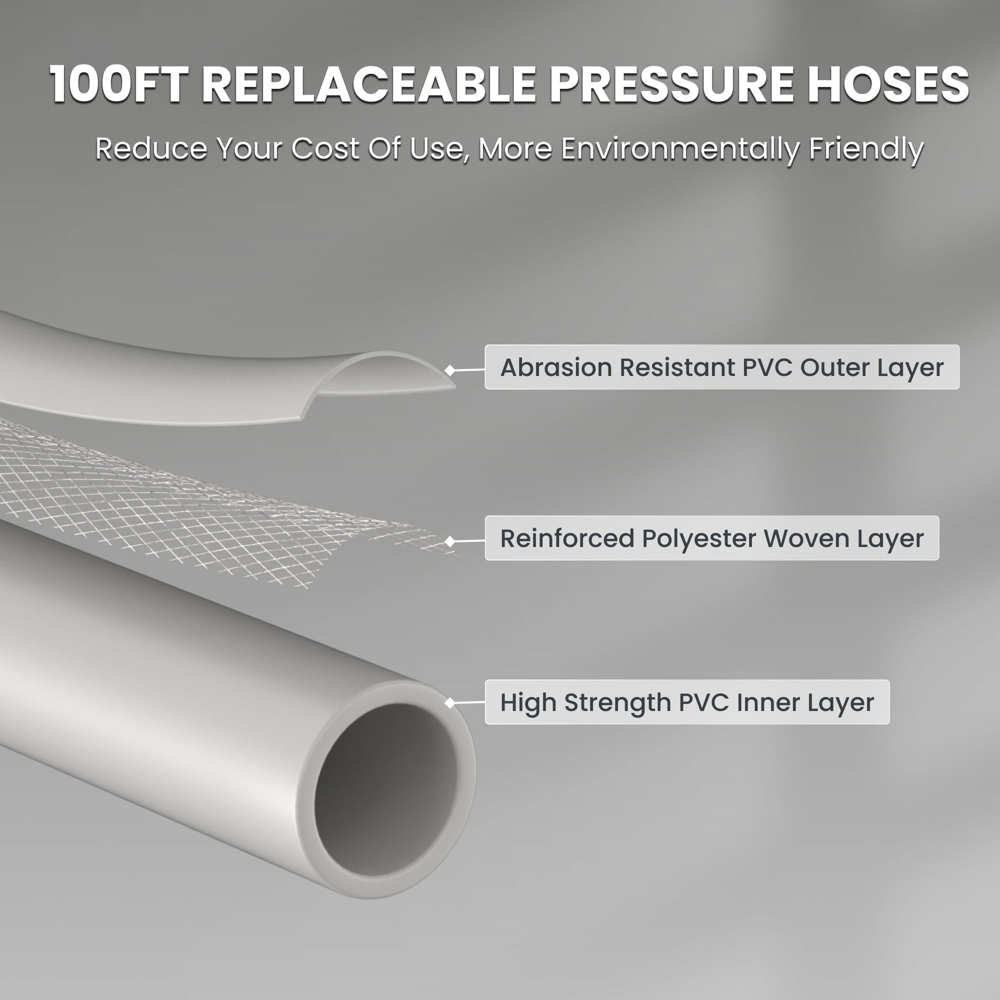 • 100 FT Replaceable Pressure Hose: Giraffe Tools Pressure Washer Plus+ featuring a 100 ft replaceable hose(32 °F-104 °F). Constructed with three-layer composite anti-explosion material, it's designed to tackle even the toughest cleaning jobs. The detachable hose is for easy recycling and reuse, reducing the amount of product waste