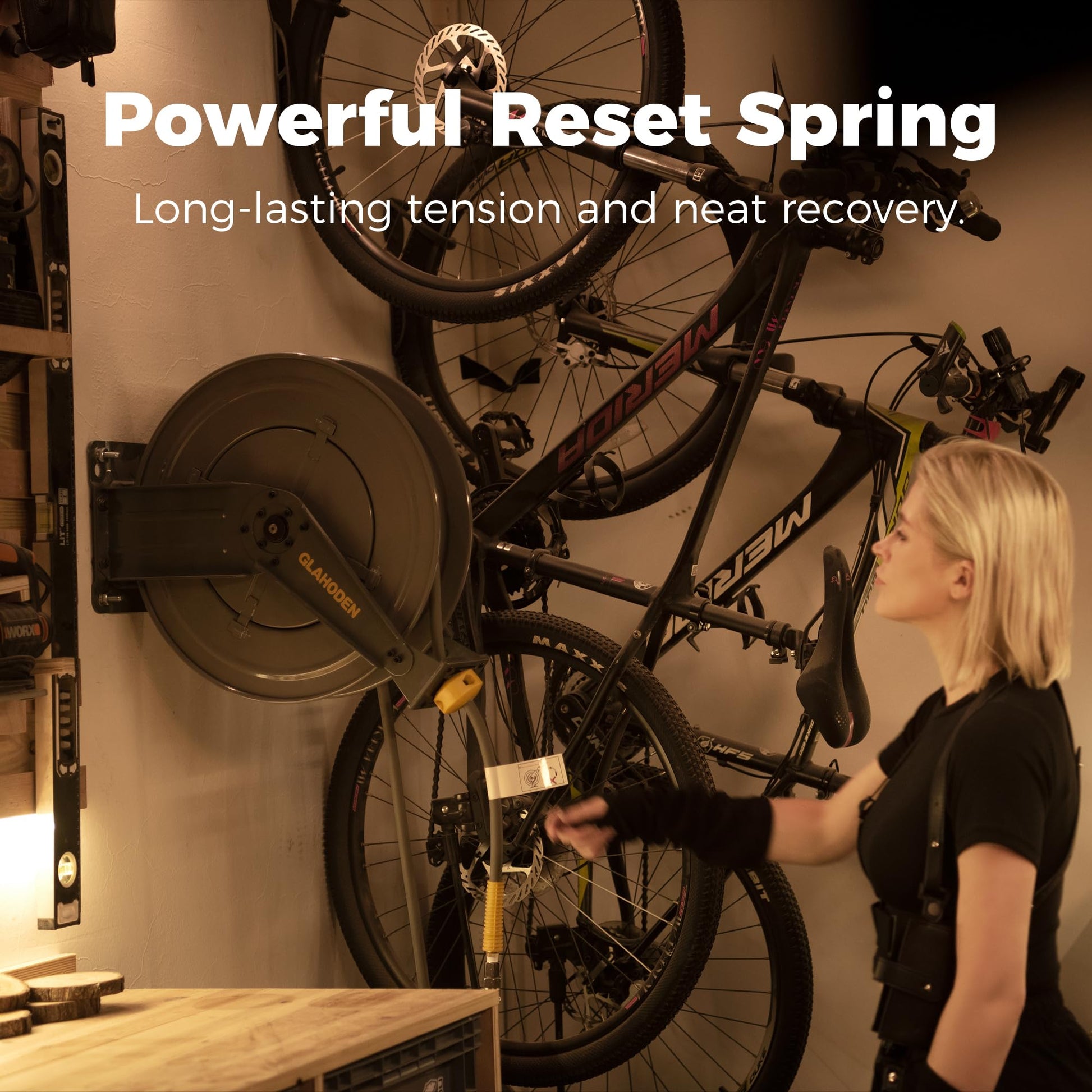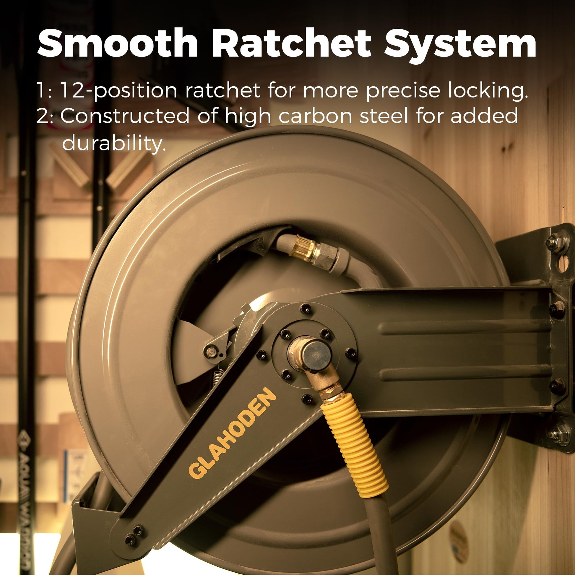 • Strong and Tangle-free Retraction: GLAHODEN retractable air hose reel uses a more powerful retracting spring, which maintains good tension even though it has been released recurrently 10,000 times. Self-leveling system winds the hose evenly, neatly and tangle-free, so that you say goodbye to 'messy' workplaces from now on.
