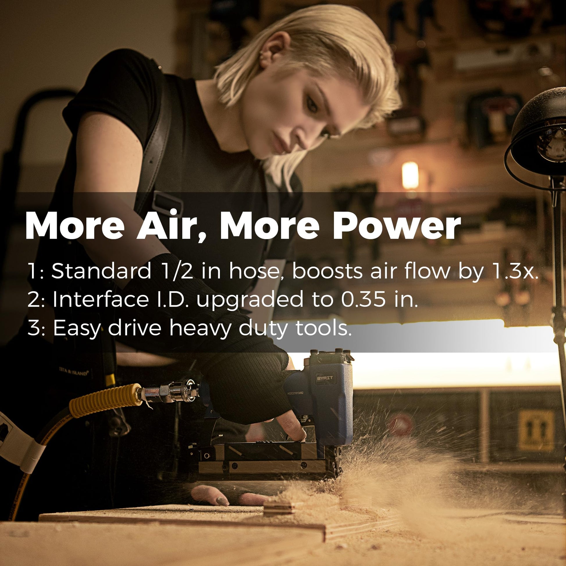 • High Flow 1/2' Hose and 5 Ft Extension Lead: Premium hybrid hose maintains all-weather flexibility (-13 to 113 °F). 0.3 in double-layer hose wall withstands up to Max 300 PSI so it won't kink, flatten, expand and crack under pressure. Swivel brass connectors allow for easy installation, and the orifice expands to 0.35 in which provides 1.3 times the airflow of 3/8 in hose to easily drive heavy tools.
