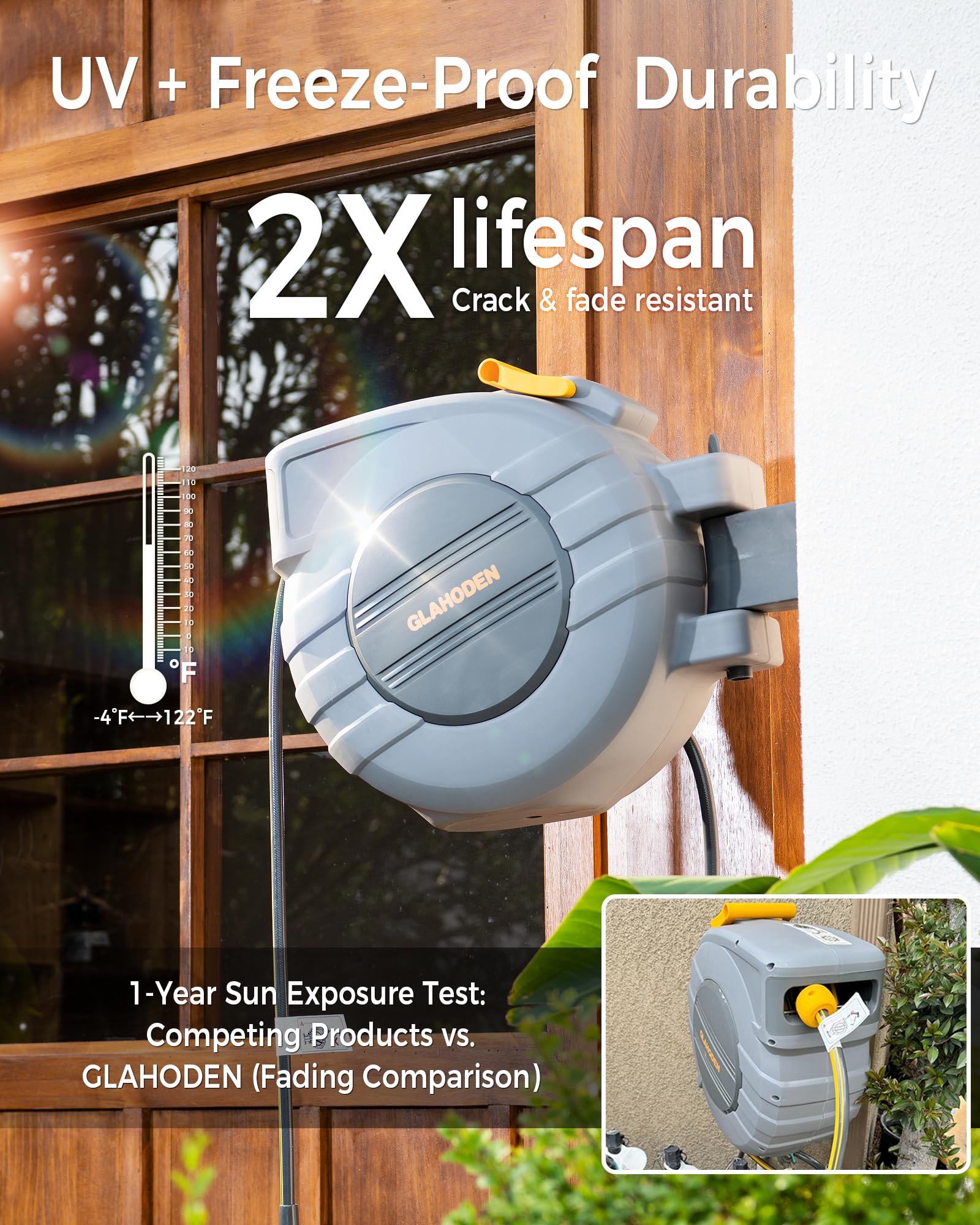 • UV + Freeze-Proof Durability: Built for outdoor use, these water hose reels feature a UV-resistant coating tested from -4°F to 122°F, doubling lifespan by resisting cracks, fading, and weather damage