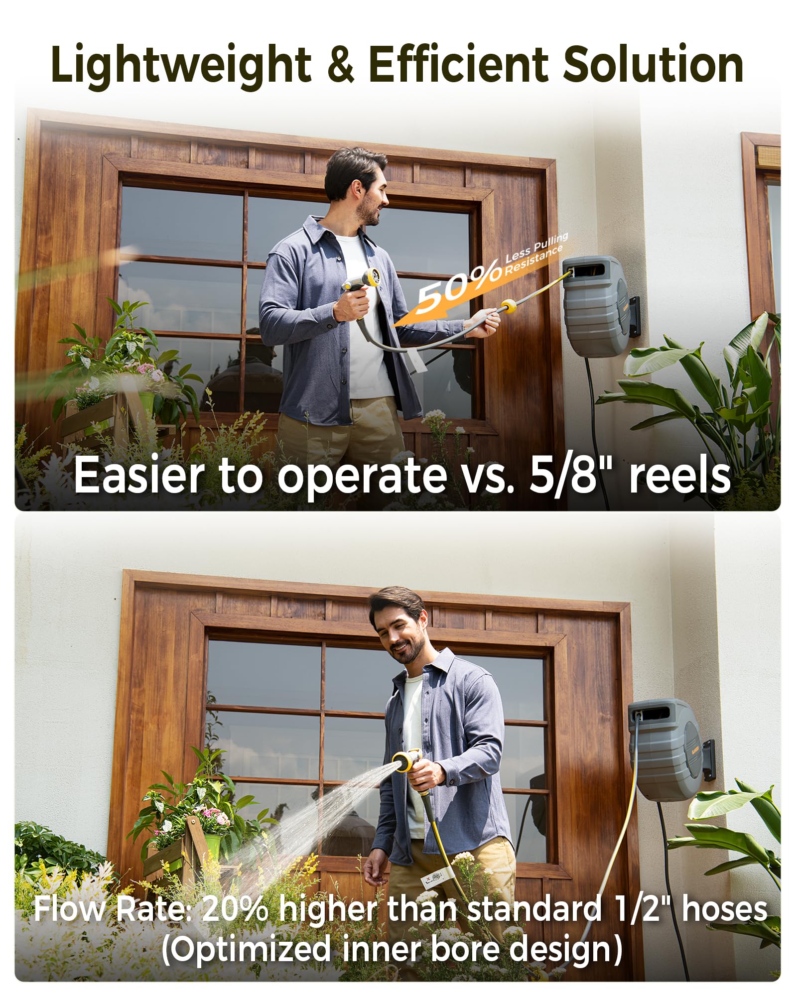 • Large Area Effortless Watering: The 1/2 inch x 130 ft retractable hose reel can achieve extensive garden coverage, while reducing stretching resistance by 50% compared to a 5/8 in hose. It can be operated with one hand, making gardening in large areas no longer a physically demanding task
