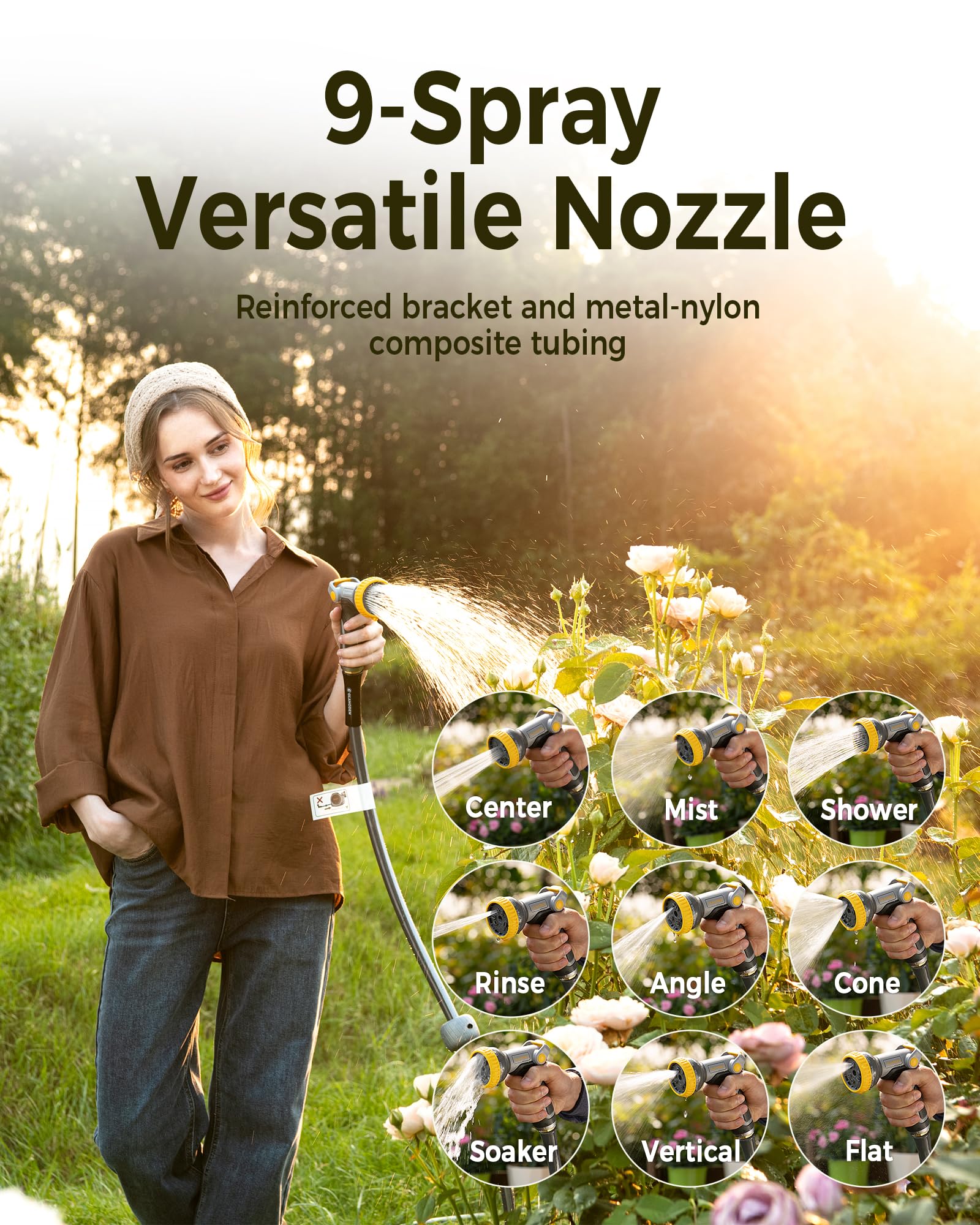• 9-Spray Versatile Nozzle: Switch between mist, jet, fan, and 6 other patterns for gardens, cars, or cleaning. Ergonomic non-slip grip enhances control