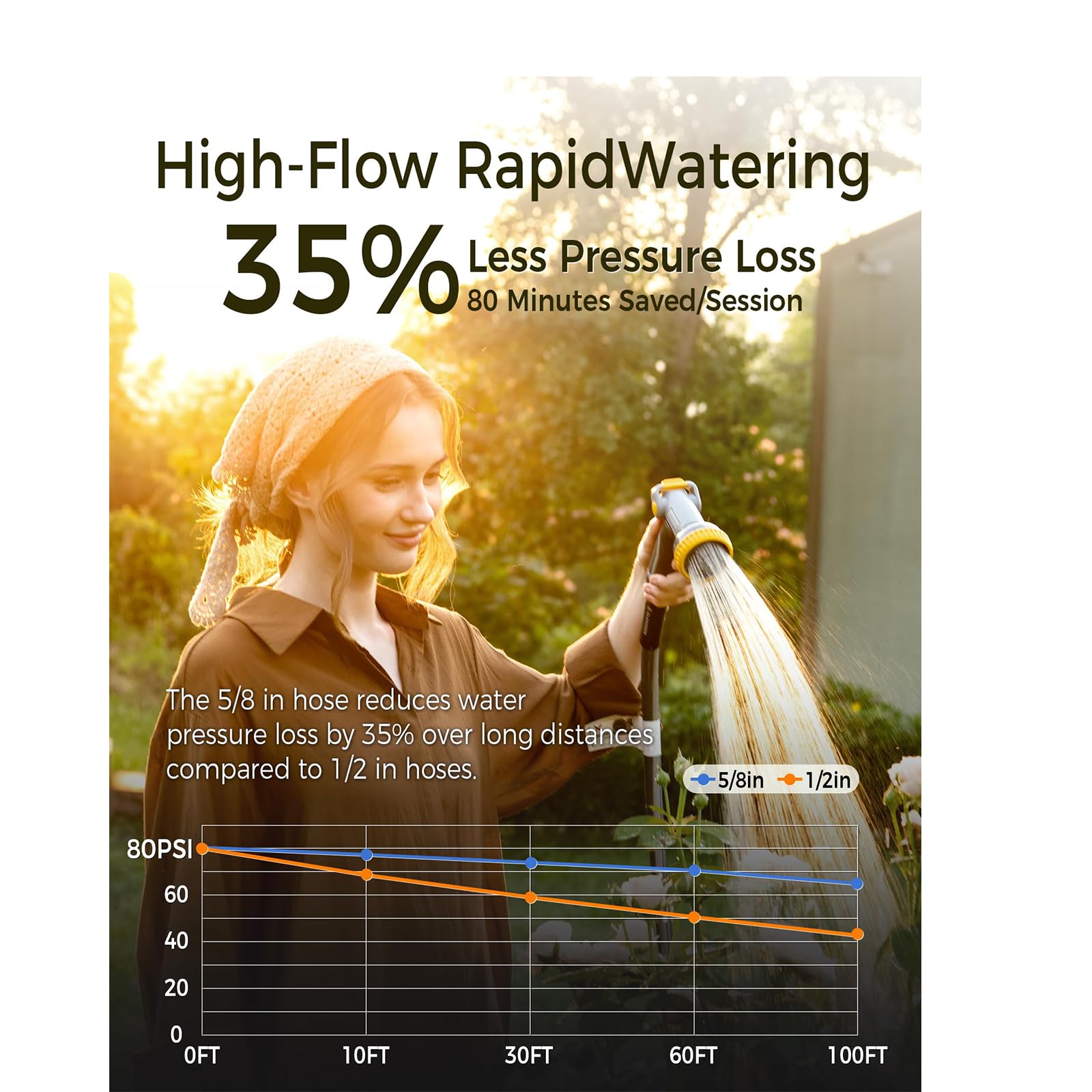 • High-Flow Rapid Watering: The 5/8 in x 100 ft hose on this retractable hose reel reduces water pressure loss by 35% over long distances compared to 1/2 in hoses, saving 80 minutes per session for irrigating basketball court-sized gardens. Ideal for large-scale, high-efficiency tasks