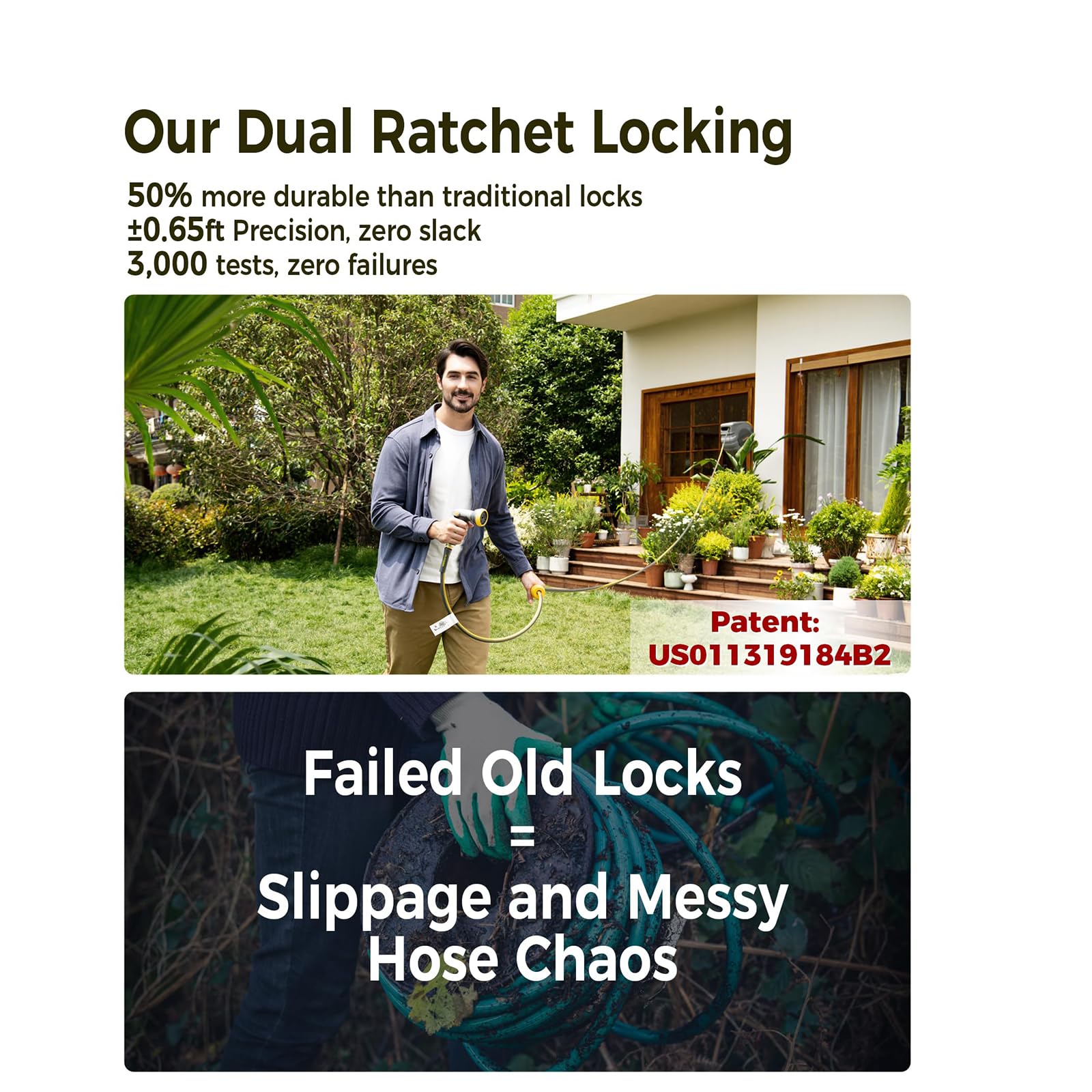 • Precision Dual Ratchet Locking (Patent: US011319184B2): GLAHODEN's auto rewind water hose reel passes 3,000 rigorous tests with ±0.65 ft locking accuracy. 50% more durable than traditional locks, it eliminates hose slack and secures exact lengths, ensuring precise positioning at balcony corners or garden edges without dragging excess hose